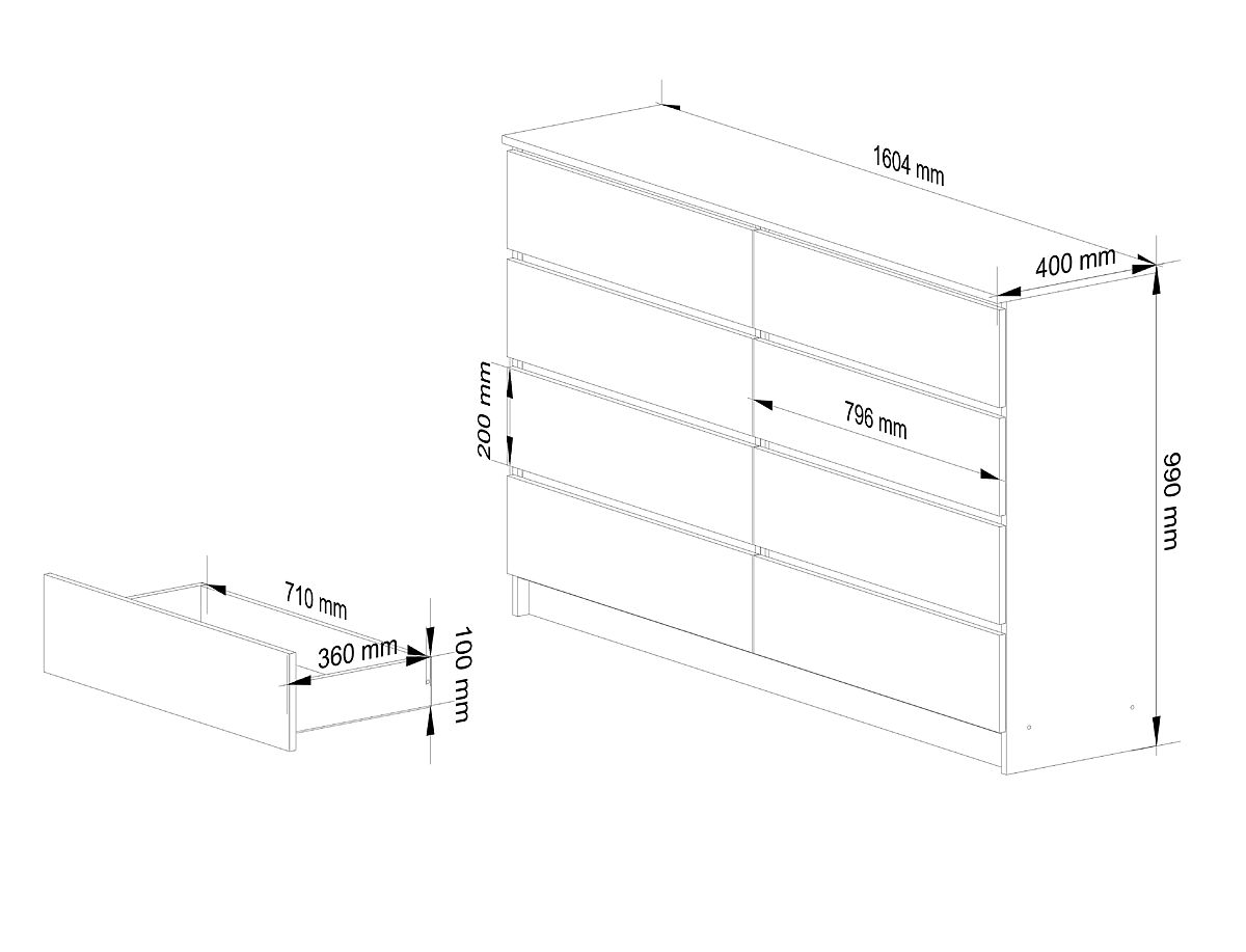 COMÒ K 160cm con 8 cassetti realizzato in pannello laminato da 16mm resistente all'usura.