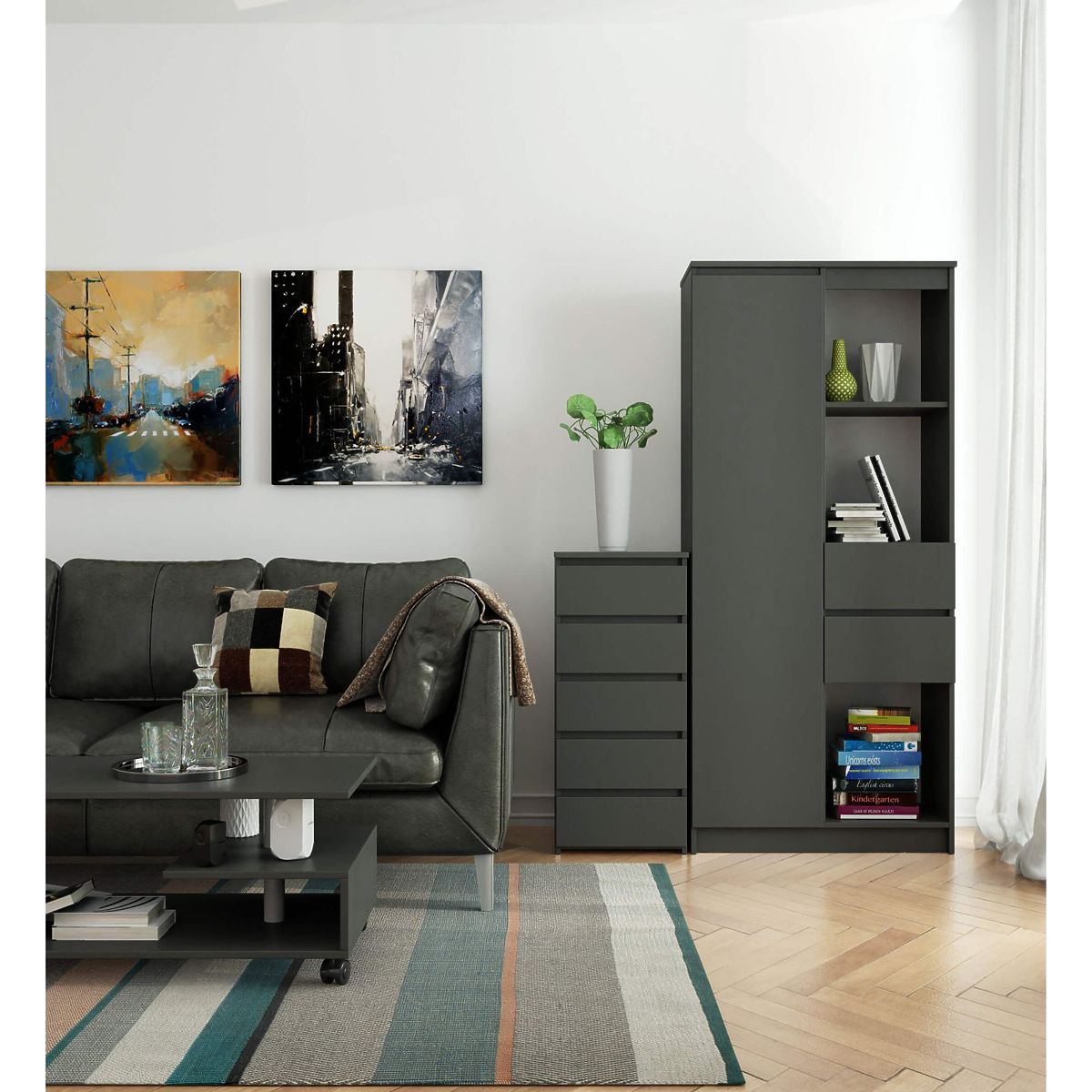- aspetto elegante - il comò è semplice nella forma, caratterizzato da un colore stiloso grafite grigio,