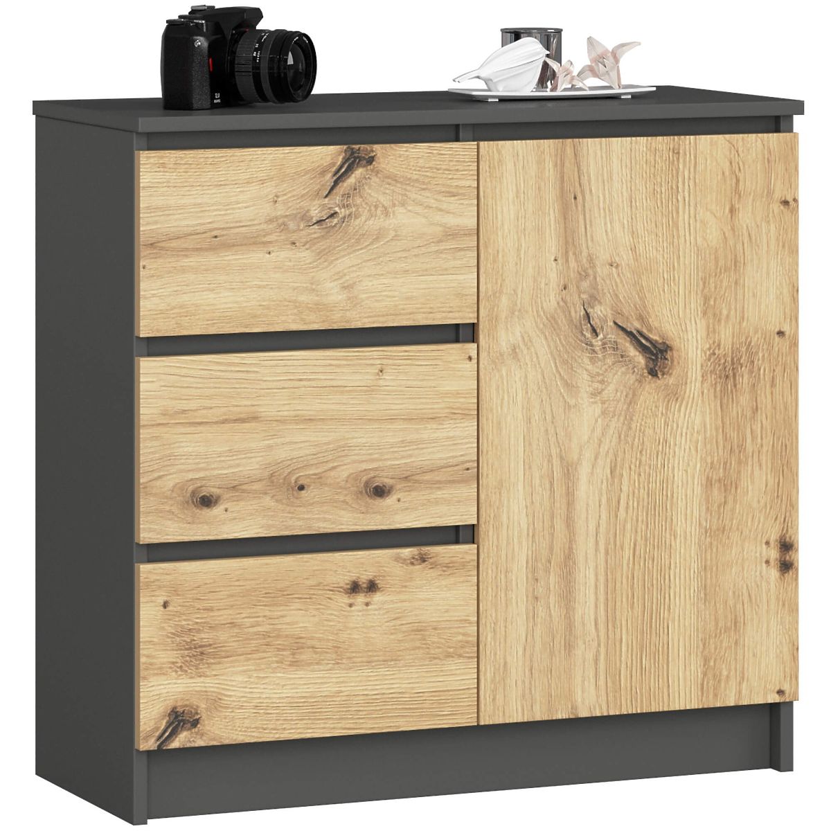 Il piccolo comò è un elemento d'arredo che trova impiego in ogni stanza. I colori moderni, la struttura solida e la lavorazione accurata hanno portato alla creazione di un mobile che si adatta perfettamente all'ingresso, al soggiorno, alla camera dei bambini e anche alla camera da letto. Può essere utilizzato anche in ufficio, dove consente di riporre numerosi documenti e altri materiali d'ufficio. Il comò è composto da un'anta (all'interno ci sono due ripiani) e 3 cassetti. Il mobile combina i colori grafite grigio e rovere artigiano.