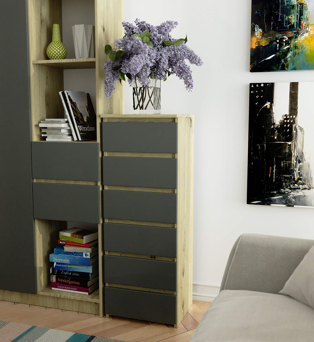 I comò sono un tipo di arredamento popolare che viene posizionato accanto al letto. Sulla sua superficie si trova spesso una lampada, mentre all'interno ci sono oggetti che facilitano il riposo e il sonno. Chi cerca un comò elegante dovrebbe prestare attenzione al comò CL6 da 40 cm nel colore rovere artisan con frontali grigi. Si adatterà magnificamente a qualsiasi camera da letto. Può essere posizionato anche nella stanza dei bambini.