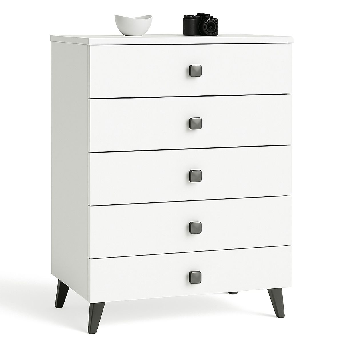 Il piccolo comò è un elemento d'arredo che trova impiego in ogni stanza. I colori moderni, la struttura solida e la lavorazione accurata hanno portato alla creazione di un mobile che si adatta perfettamente all'ingresso, al soggiorno o alla camera dei giovani, così come alla camera da letto. Può essere utilizzato anche in un ufficio, dove permette di riporre molti documenti e altri articoli per ufficio. Il comò è composto da 5 cassetti. Il mobile combina il colore bianco e nero.