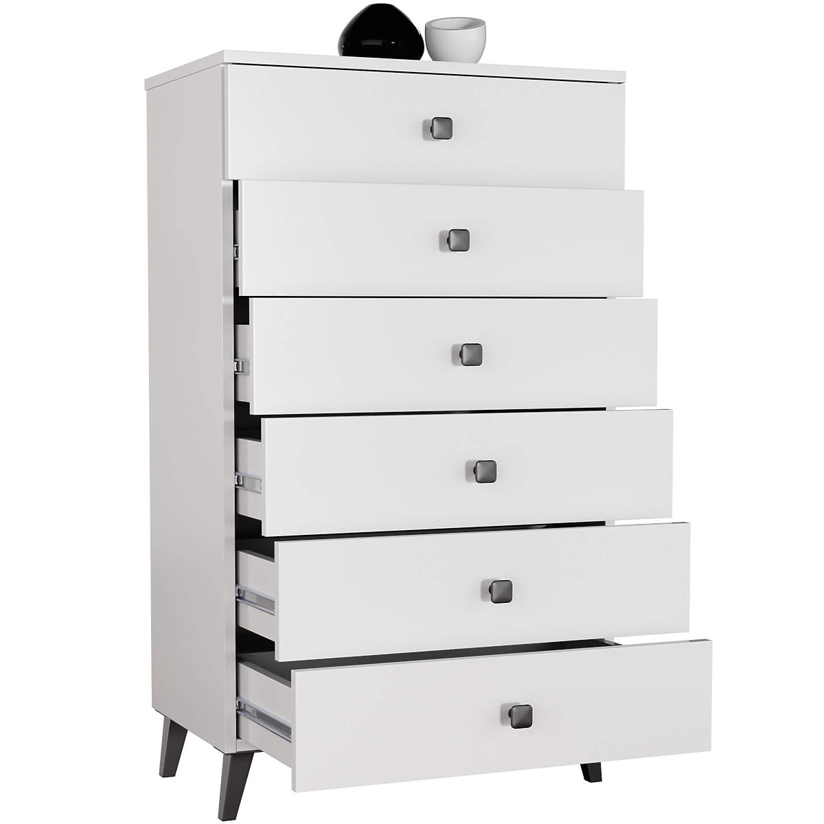 Il piccolo comò è un elemento d'arredo che trova impiego in ogni stanza. I colori moderni, la struttura solida e la lavorazione accurata hanno portato alla creazione di un mobile che si adatta, ad esempio, nell'ingresso, nel soggiorno o nella camera dei bambini, ma anche nella camera da letto. Può essere utilizzato anche in ufficio, dove consente di riporre molti documenti e altri articoli per ufficio. Il comò è composto da 6 cassetti. Il mobile combina il colore bianco e nero.