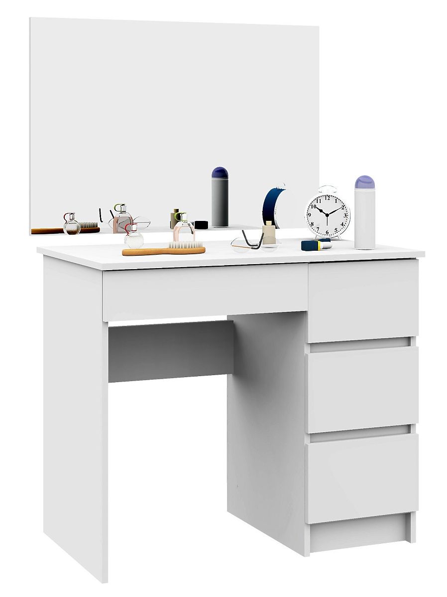 La toilette da trucco con specchio è un eccellente mobile per il trucco. La toilette ha un piano funzionale su cui è possibile posare gli oggetti più necessari e quattro spaziosi cassetti che possono contenere tutti i piccoli oggetti. Insieme allo specchio adattato, la toilette crea condizioni ideali per il trucco e la routine quotidiana femminile sarà d'ora in poi molto più piacevole. Le dimensioni adeguate della toilette (altezza 77 cm, larghezza 90 cm, profondità 50 cm) garantiscono un movimento e un utilizzo confortevoli della toilette. Il grande specchio (60 cm per 90 cm) consente l'esecuzione precisa anche delle operazioni cosmetiche più complesse. Questo set è adatto anche in spazi ridotti. La toilette è realizzata in pannello laminato resistente, resistente all'abrasione e ai danni, e il colore bianco neutro e alla moda si adatta a qualsiasi interno. Mobile ideale per la camera da letto o un'altra stanza, che delizierà ogni donna che si prende cura della bellezza.