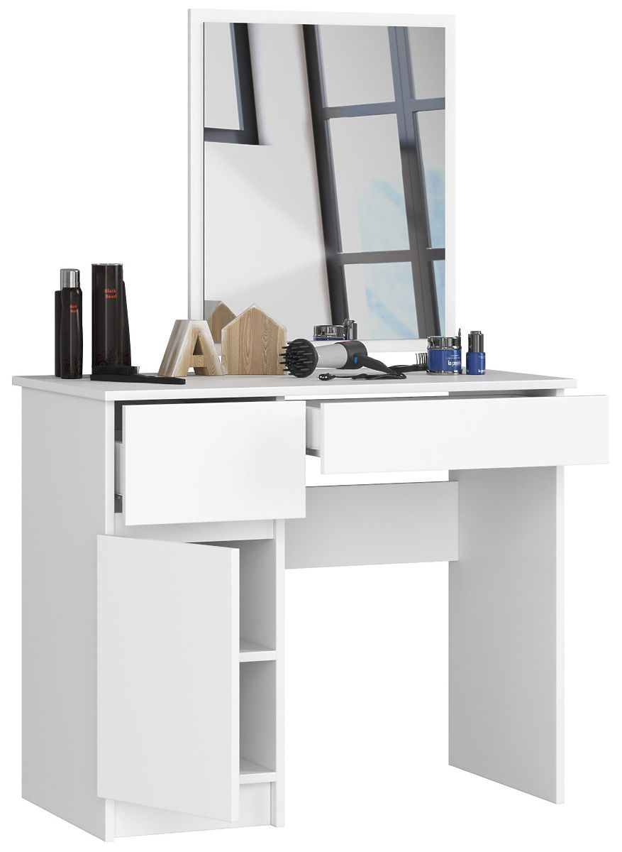 Tavolino da toeletta con specchio in tonalità bianca con cassetti e ampio spazio dietro le ante. Configurazione sinistra.