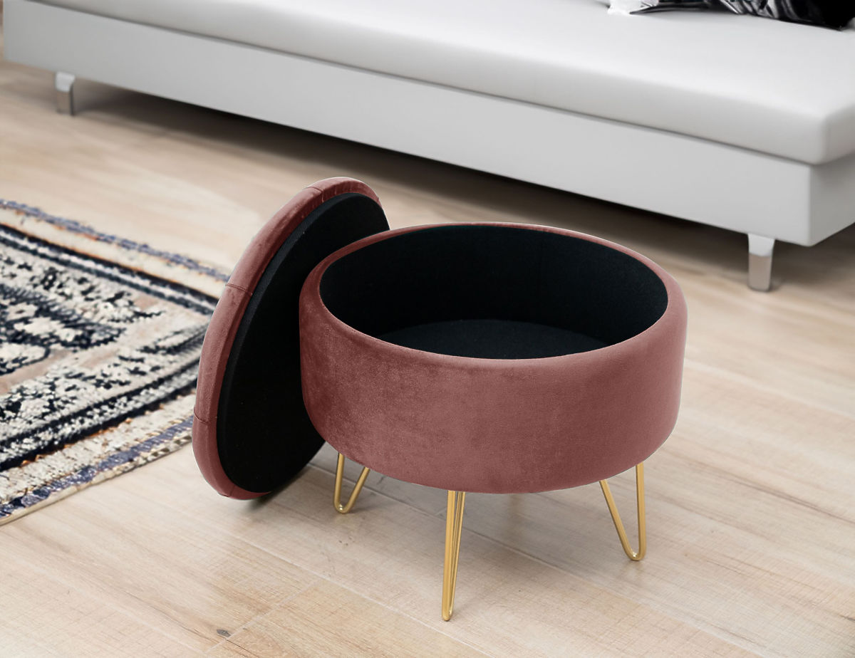 Pouf con gambe dorate e spazio di stoccaggio. .. altro