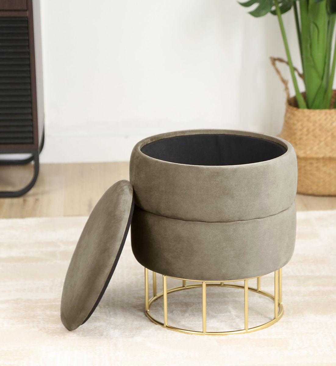 Pouf con spazio di archiviazione su base metallica di colore oro.