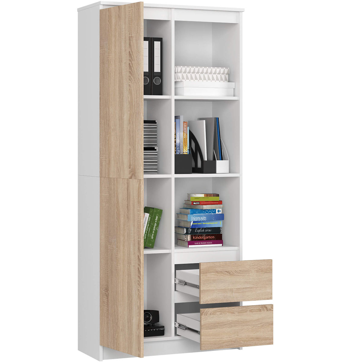 Scaffale da ufficio con ante e cassetti in combinazione di colori bianco e rovere sonoma.