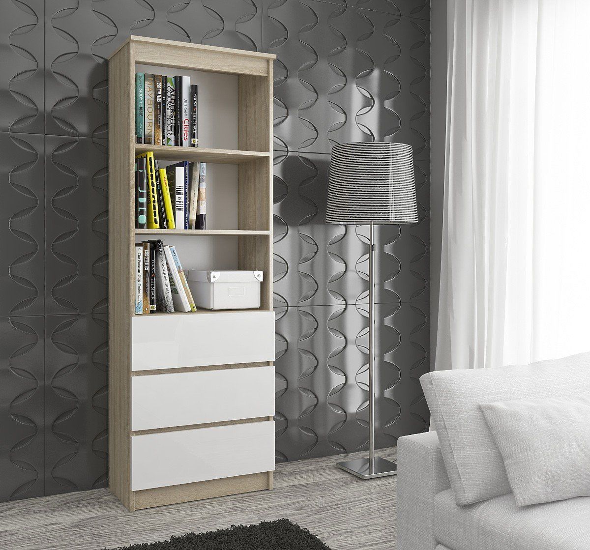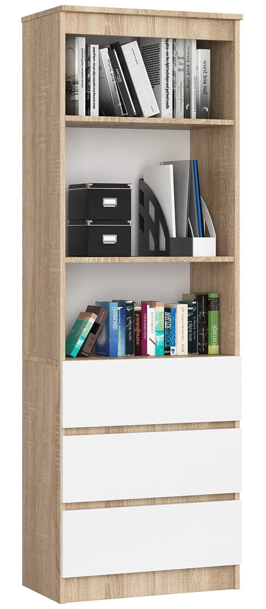 Lo scaffale da ufficio, modello CLP, si distingue per la combinazione originale di colori. Il colore naturale del rovere sonoma del corpo del mobile e il bianco universale dei frontali dei cassetti creano una combinazione perfetta, ideale per lo stile di un ufficio moderno e uno studio domestico. L'aspetto elegante è un grande vantaggio di questo modello.
