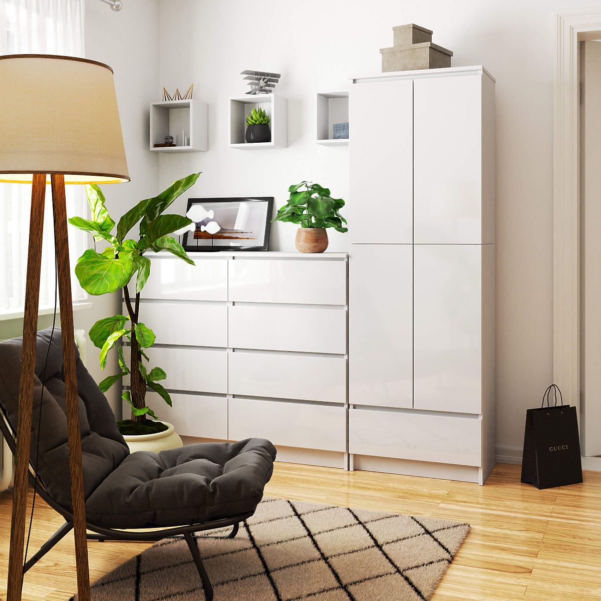 La libreria bianca da ufficio con cassetto è la perfetta combinazione di funzionalità e attrattiva visiva. Il mobile è pratico e facile da mantenere perfettamente pulito, ed è anche molto elegante. Nella parte chiusa si trovano ampi ripiani, mentre nella parte inferiore c'è un cassetto spazioso e facile da estrarre. L'uso della libreria è molto versatile e dipende dalle esigenze individuali. Nell'armadio possono essere conservati libri, raccoglitori con documenti e forniture per ufficio, così come può essere utilizzata per stoviglie, tovaglie o asciugamani. Il colore bianco classico e la forma semplice della libreria assicurano che il mobile si adatti a qualsiasi interno, indipendentemente dal colore delle pareti o dallo stile in cui è arredato. Il mobile è realizzato in materiale resistente, ovvero pannello laminato resistente all'usura e ai danni. I bordi dell'armadio sono rivestiti con un bordo ABS durevole ed estetico. I frontali della libreria sono laccati a lucido, conferendo ulteriore eleganza al mobile. Le ante superiori e inferiori sono unite in un unico pezzo e non si aprono separatamente.