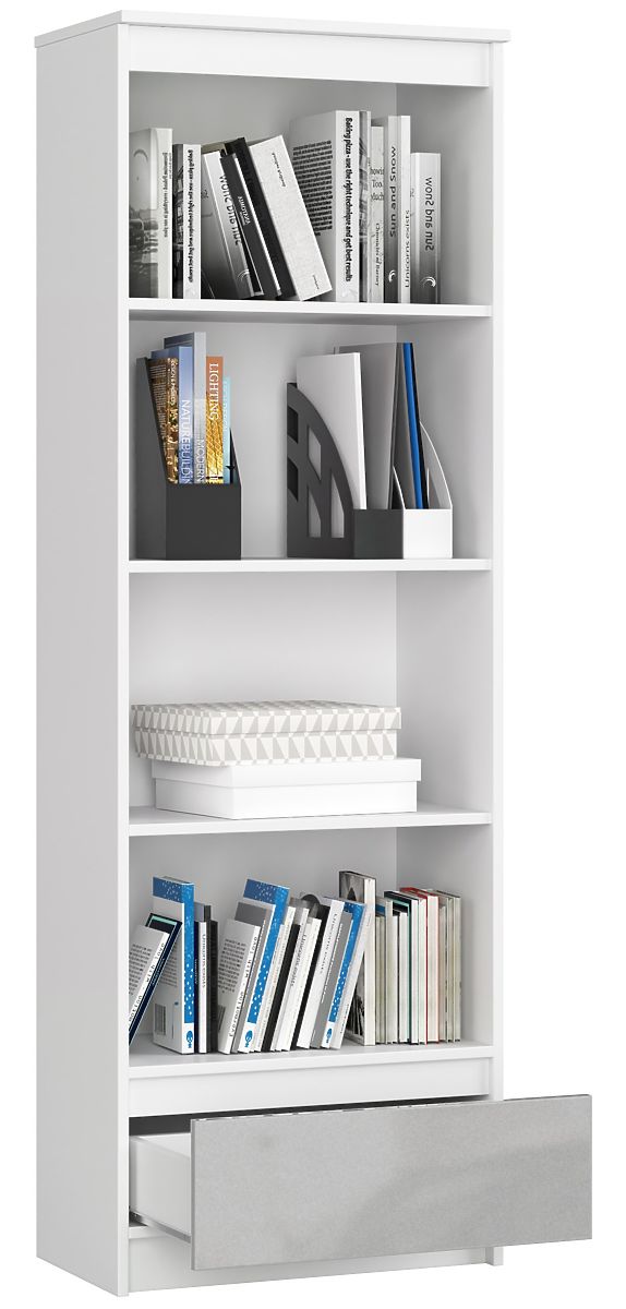 Lo scaffale è un mobile che trova applicazione in ogni casa. Può essere utilizzato per riporre libri, cartelle e raccoglitori con documenti, album fotografici, ma anche cornici, souvenir o molti altri oggetti. È più comunemente visto nella stanza dei giovani, nel soggiorno o nell'ufficio domestico, ma è adatto anche per spazi ufficio. Lo scaffale presentato è una combinazione di buon prezzo, funzionalità, qualità e design. Merita riconoscimento grazie alla combinazione di due colori più alla moda e allo stesso tempo senza tempo - bianco e grigio. Lo scaffale è composto da quattro grandi ripiani e un ampio cassetto. L'armadio è molto stabile, caratterizzato da una costruzione solida e attenzione ai dettagli. È realizzato in pannello laminato con durata e resistenza all'usura superiori alla media. Le parti frontali sono progettate in grigio lucido, che conferisce all'insieme un carattere unico. Vi invitiamo anche a conoscere altri elementi di arredamento per ufficio di questa collezione.