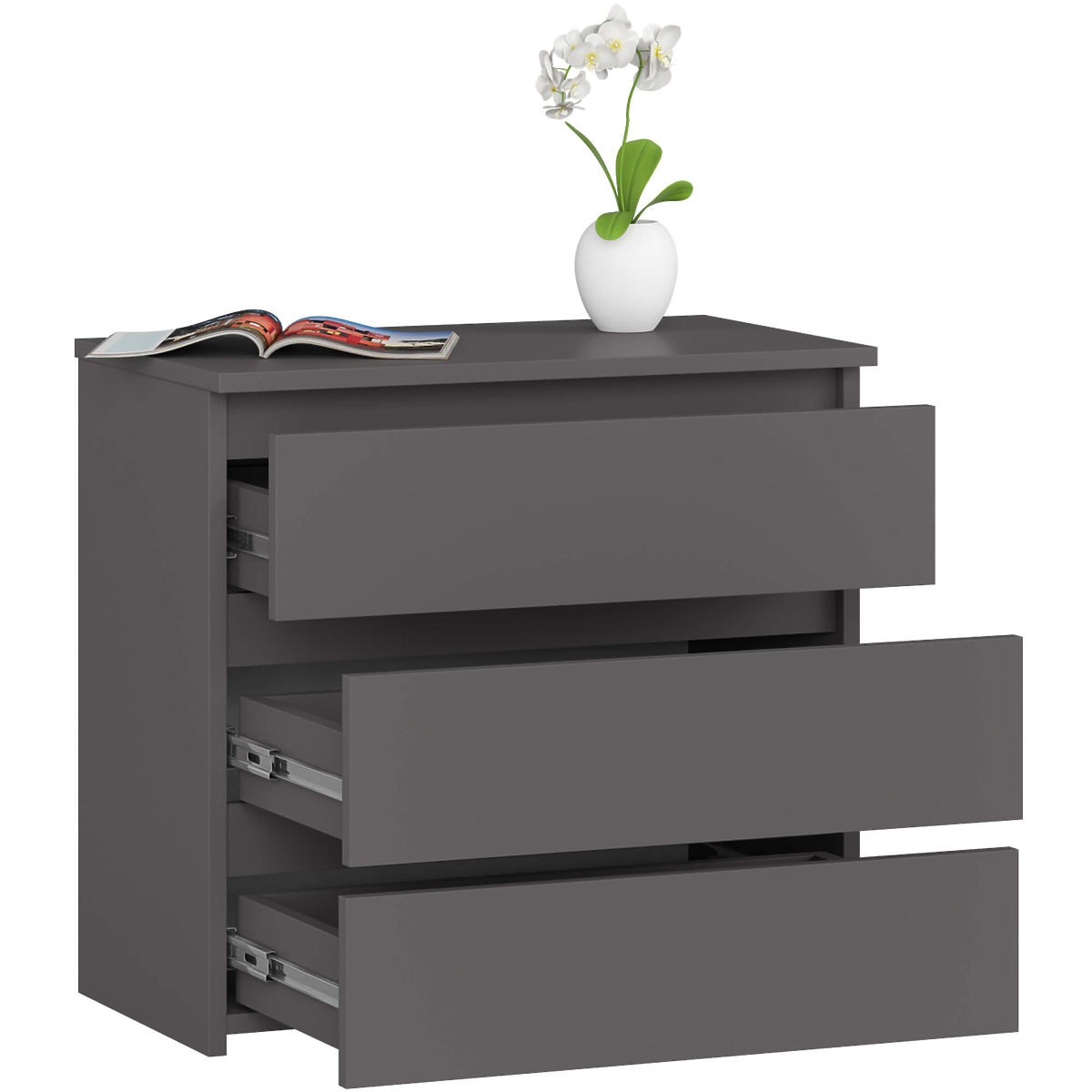 Il comò grafite grigio ha 3 cassetti facilmente apribili. È perfetto per la camera da letto come elemento essenziale del suo arredamento. Nei cassetti si possono riporre biancheria, accessori cosmetici o un set di biancheria da letto di ricambio. Il piano è ideale per posizionare una lampada da notte e appoggiare una lettura interessante. Il mobile può essere collocato anche nella stanza dei bambini e nella camera di un adolescente.