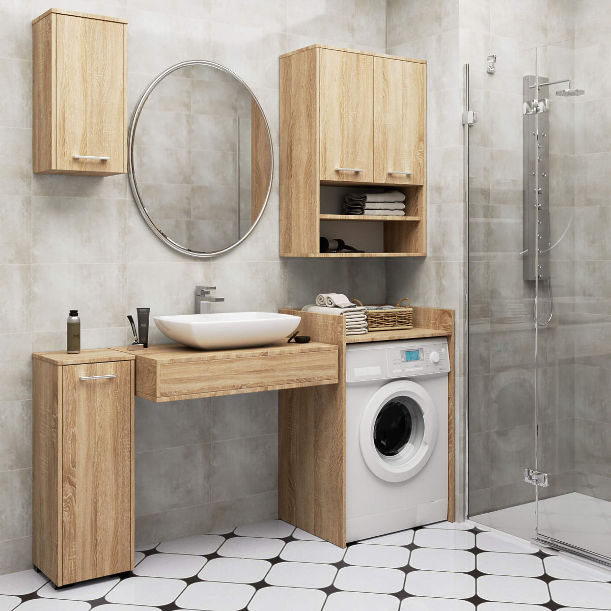 Per arredare il bagno in modo confortevole e allo stesso tempo elegante, è consigliabile optare per mobili solidi e funzionali. Un esempio è sicuramente il coperchio sopra la lavatrice. È un modo ideale per sfruttare lo spazio sopra la lavatrice, che di solito rimane inutilizzato. Le dimensioni ottimali di questo mobile lo rendono una soluzione eccellente per bagni di piccole dimensioni. La forma ergonomica consente il suo utilizzo in qualsiasi stanza. La bellissima tonalità di rovere sonoma garantisce un aspetto elegante al bagno. Il pannello laminato con cui è realizzato questo mobile è un materiale di alta qualità. Garantisce durata e robustezza ai mobili, oltre a mantenere il loro aspetto estetico.