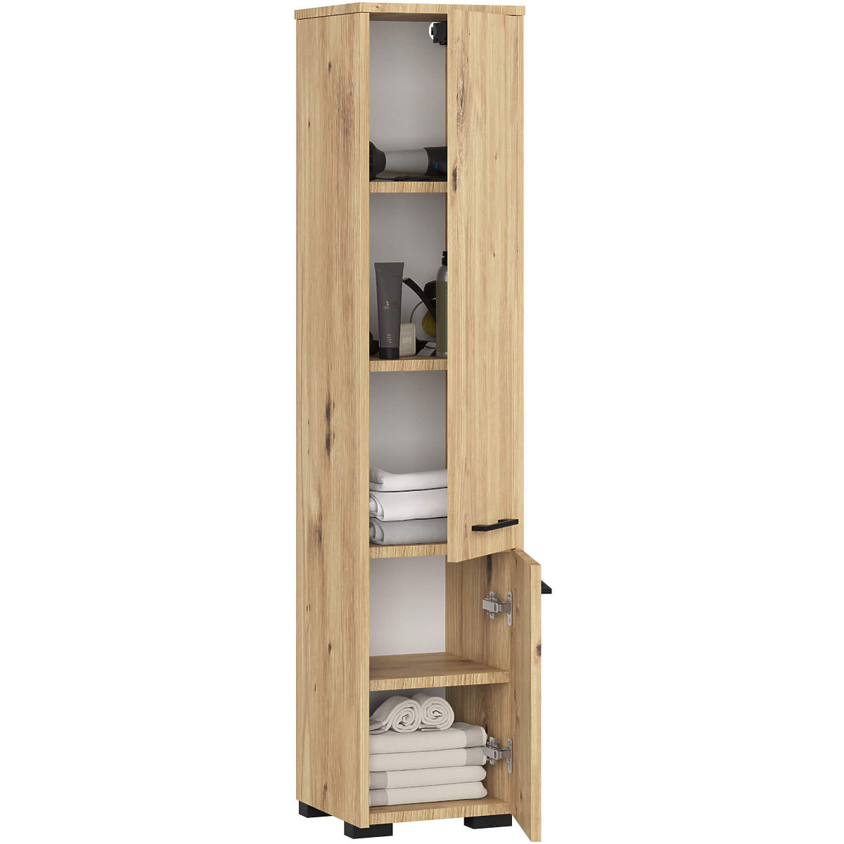 L'armadietto da bagno Fin 2 ante è un mobile universale che può essere utilizzato in ogni bagno, indipendentemente dalle sue dimensioni. Il design elegante e il colore rovere artigiano garantiscono che l'armadietto si abbina perfettamente a qualsiasi stile di bagno, con arredamenti classici o moderni, e anche con piastrelle e rivestimenti di diverse tonalità. Grazie alle sue dimensioni, l'armadietto da bagno può riempire spazi spesso inutilizzati nell'angolo del bagno, così come essere posizionato accanto al lavabo, alla lavatrice o al box doccia. L'armadietto da bagno Fin si distingue per la sua lavorazione molto accurata. Ha due ante comode e ampie con maniglie ergonomiche che garantiscono un facile accesso all'interno del mobile. I ripiani profondi e spaziosi sono ideali per riporre asciugamani, articoli da toeletta, cosmetici o prodotti per la pulizia. L'armadietto da bagno è realizzato in pannello laminato resistente all'abrasione e all'acqua. I bordi ABS, che rifiniscono l'armadietto, sono resistenti, non scoloriscono e proteggono ulteriormente l'armadietto dai danni.