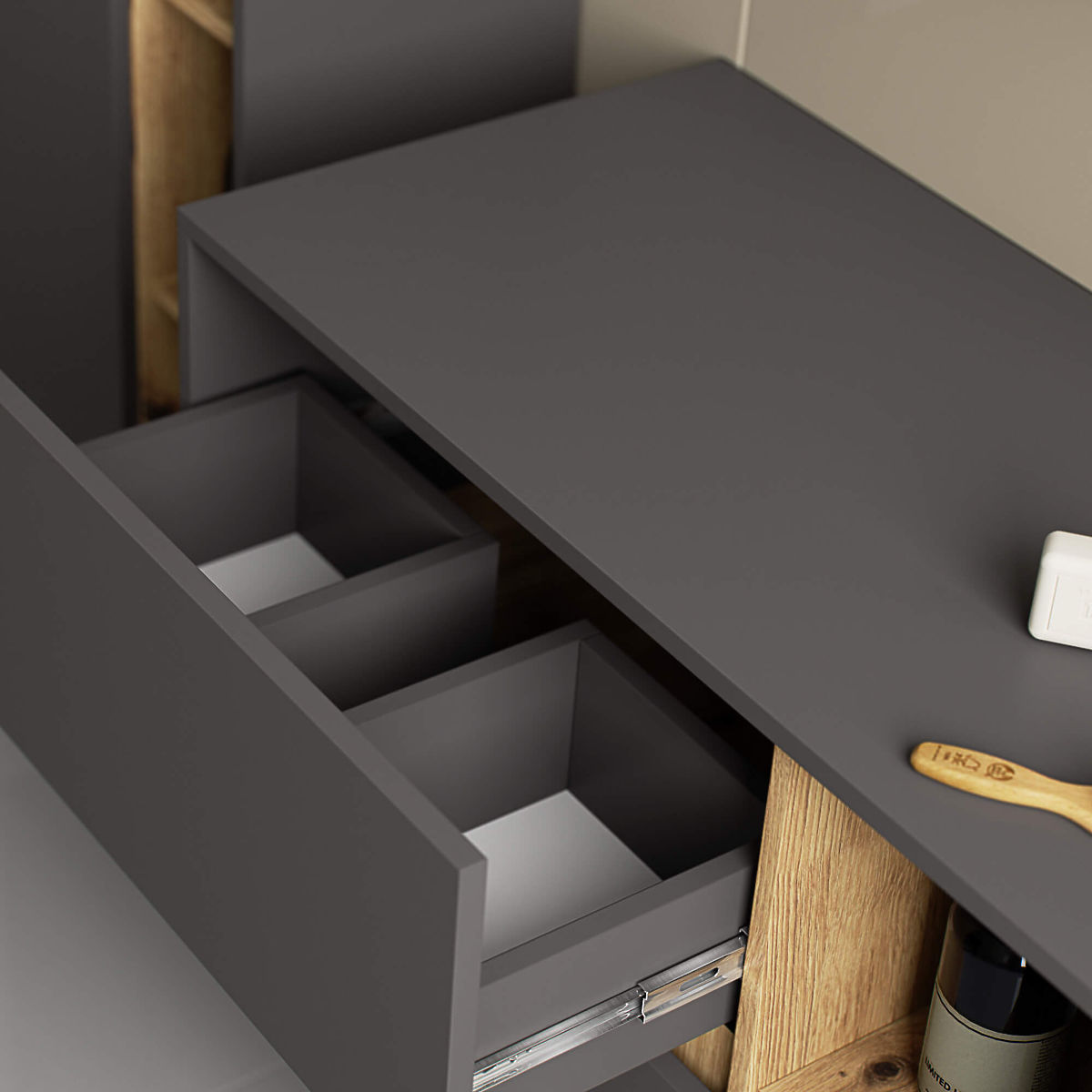 I nostri mobili sono realizzati in pannello truciolare laminato di spessore 16 mm. Grazie a ciò, sono molto durevoli, resistenti e resistenti all'umidità. Tuttavia, non devono essere esposti a contatto prolungato con l'acqua, che può causare rigonfiamenti e deformazioni del pannello. I mobili con cassetti sono dotati di guide a sfera che assicurano che i cassetti si aprano facilmente e silenziosamente.