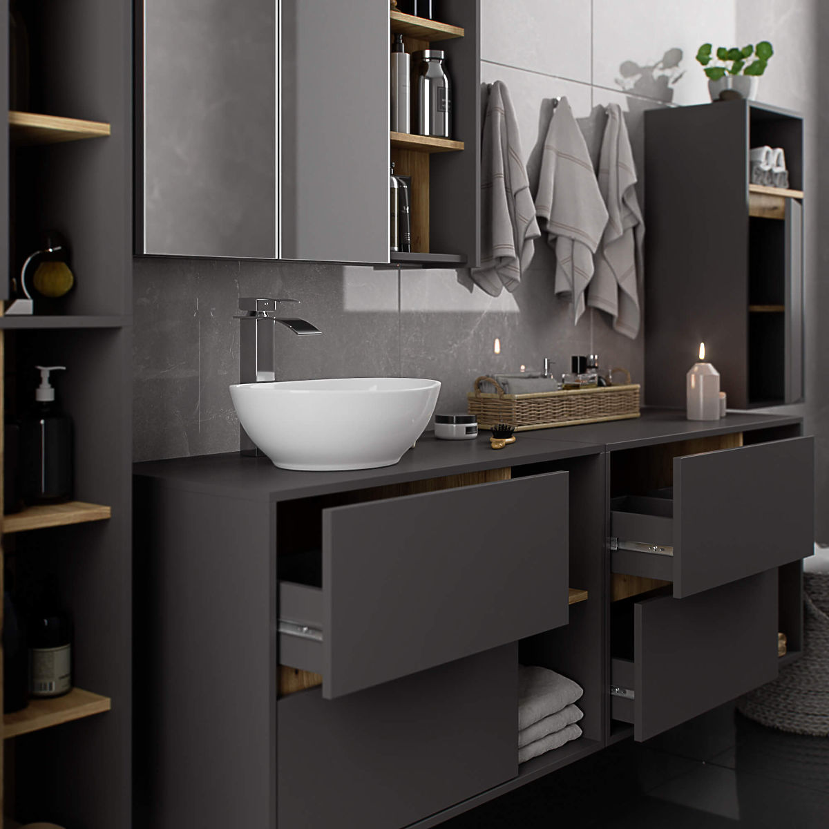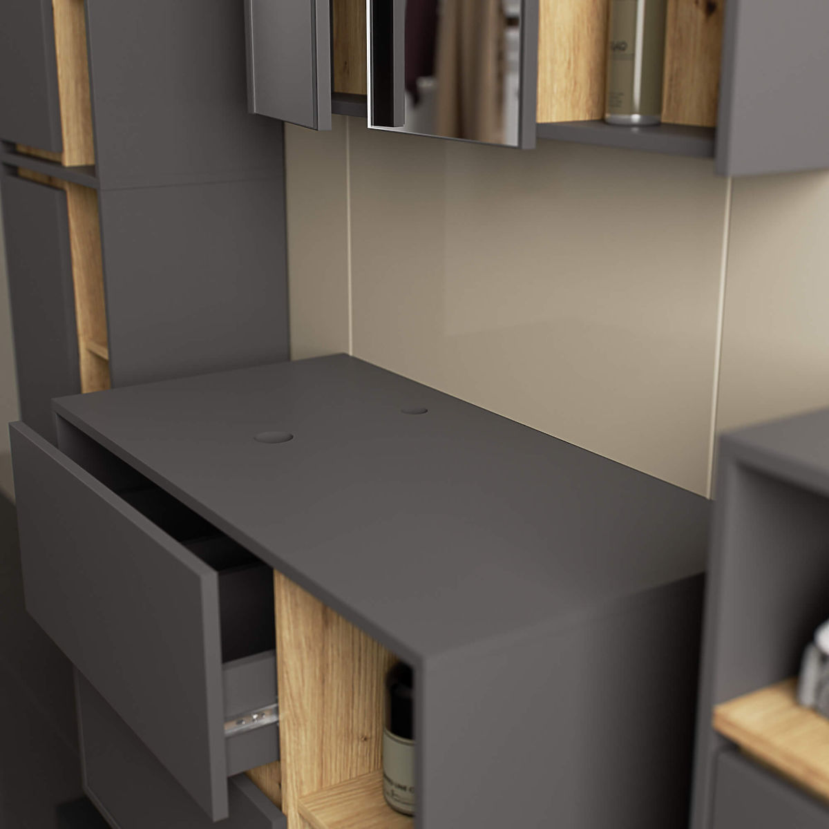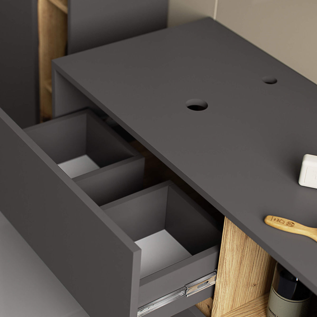 Armadio sospeso da bagno sotto lavabo 90 cm VAMI W90 si abbina perfettamente a un interno moderno. La configurazione con 2 cassetti e 2 ripiani aperti offre grande comodità d'uso. Nei cassetti spaziosi si possono riporre prodotti igienici e cosmetici, mentre sui ripiani aperti si possono posizionare ad esempio decorazioni che conferiscono all'interno un carattere personale. Il modello descritto di armadio sospeso sotto lavabo ha 2 fori nel piano destinati all'installazione del lavabo e del sifone. L'armadio ha anche cassetti appositamente sagomati che permettono l'installazione del sifone e degli elementi idraulici. ATTENZIONE! Il mobile è fornito senza lavabo e rubinetteria.