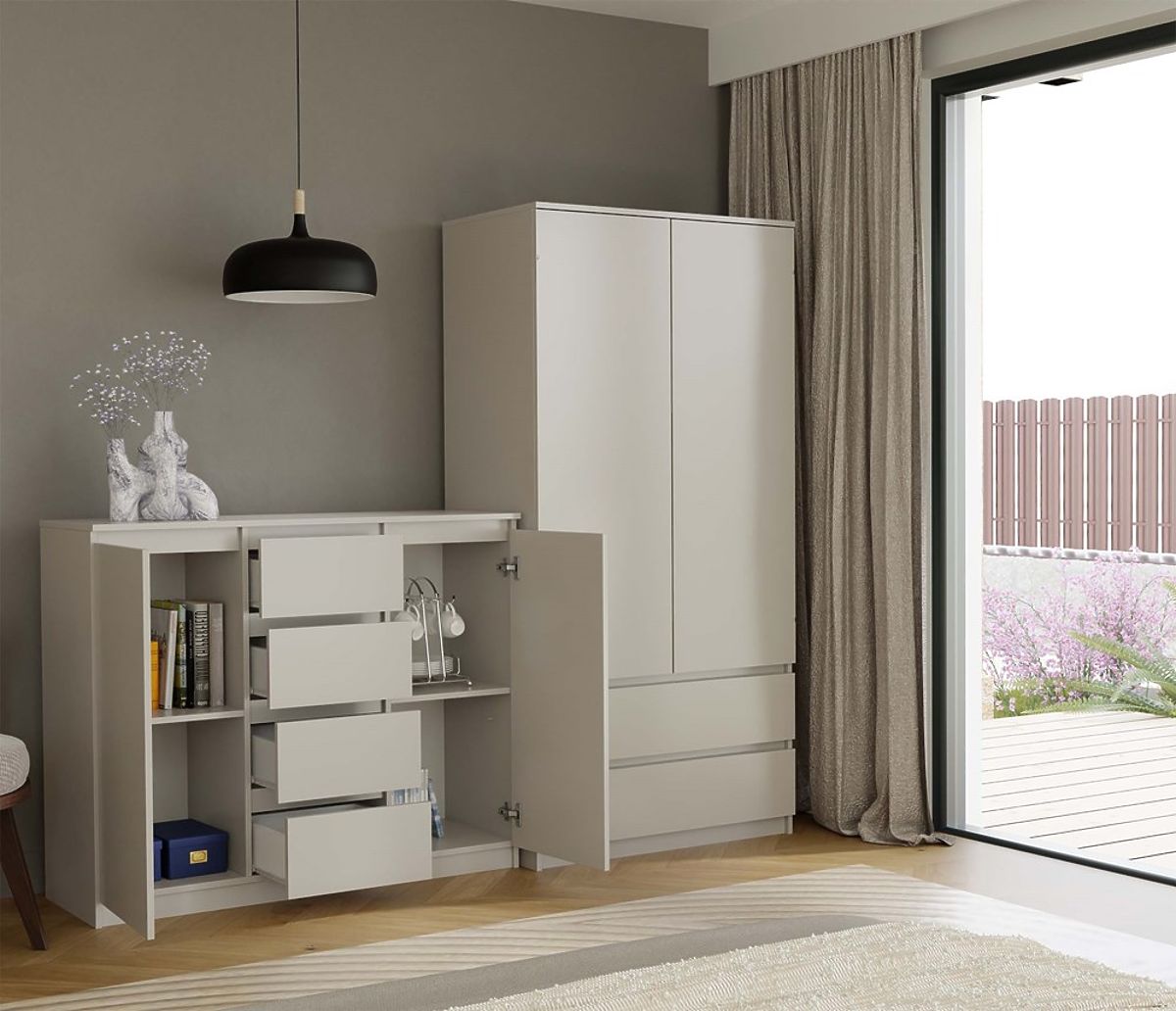 Cassettiera moderna con 2 ante e 4 cassetti in colore cashmere. .. altro