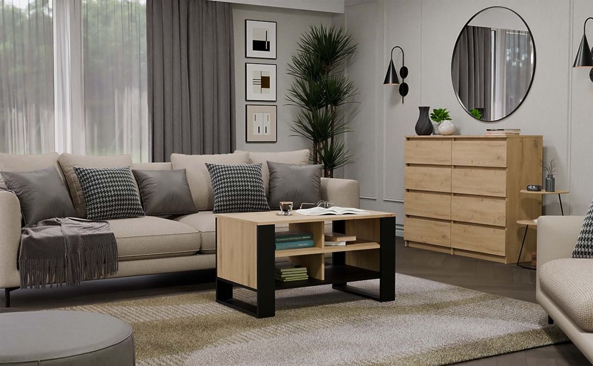 Il tavolino è realizzato in pannello laminato doppio con durezza aumentata, rendendo la superficie del mobile più resistente ai graffi. L'uso di materiali di qualità, la forma interessante delle gambe e l'ampio piano hanno permesso di creare un pezzo di arredamento indispensabile.