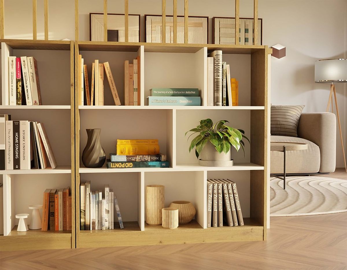 Scaffale moderno Fiesta 8P con 8 scomparti in rovere artisan e bianco. .. altro
