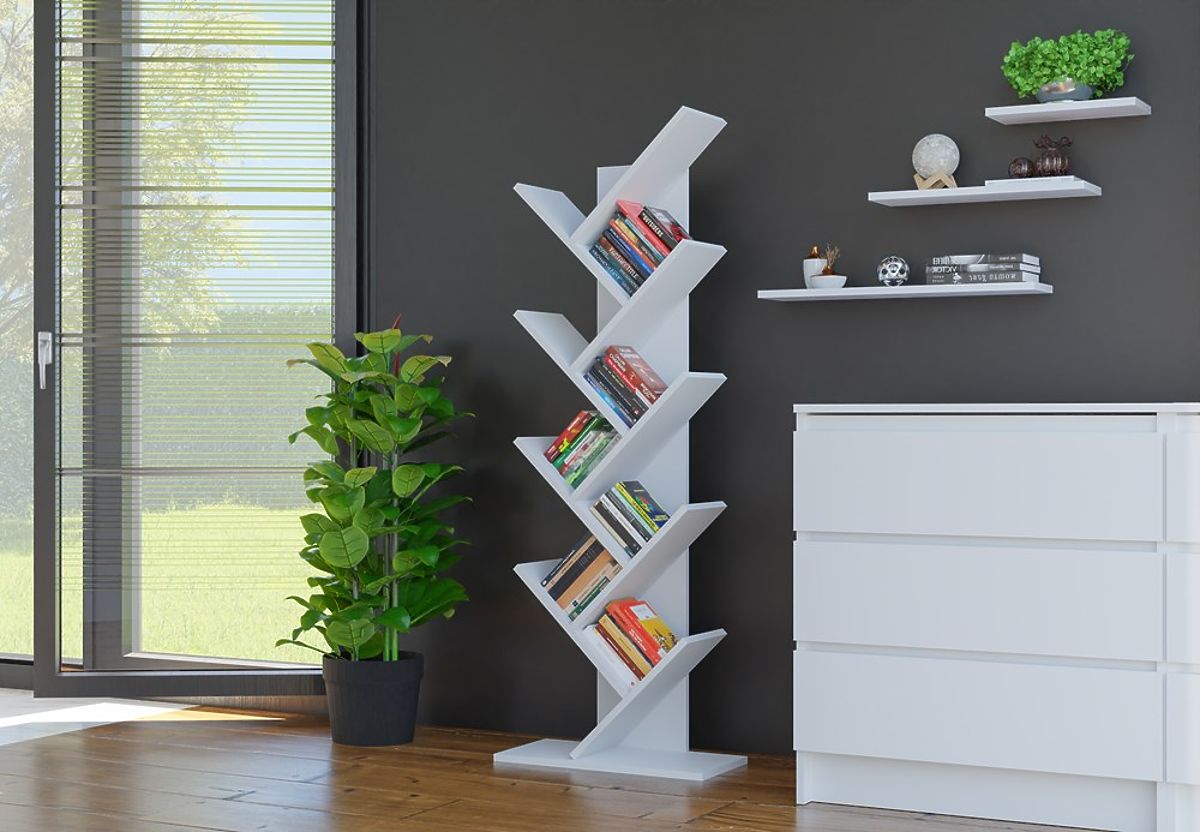 Scaffale geometrico bianco opaco con 8 ripiani inclinati aperti. .. altro