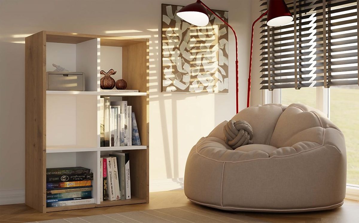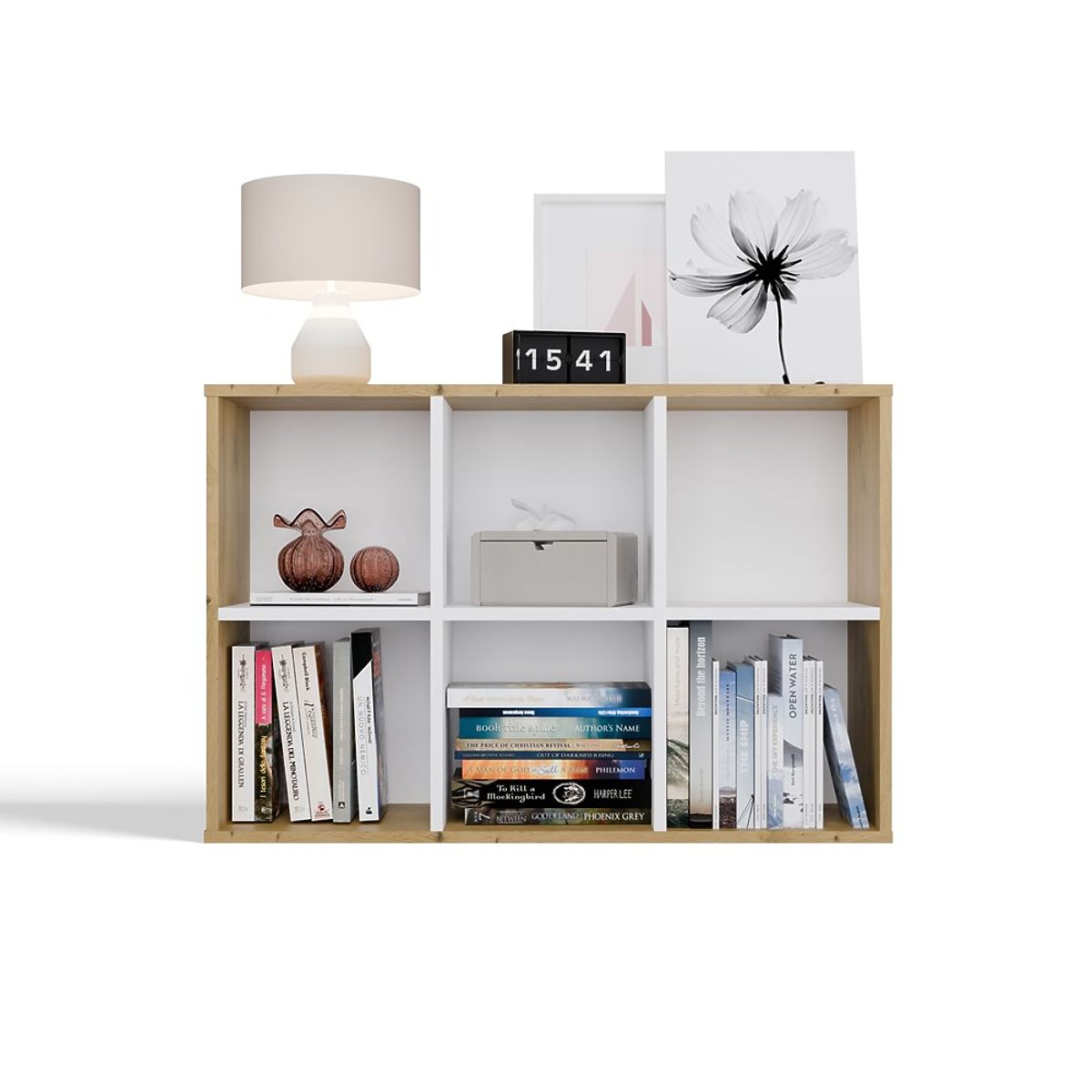Scaffale moderno per libri e giocattoli con design bianco e rovere. .. altro