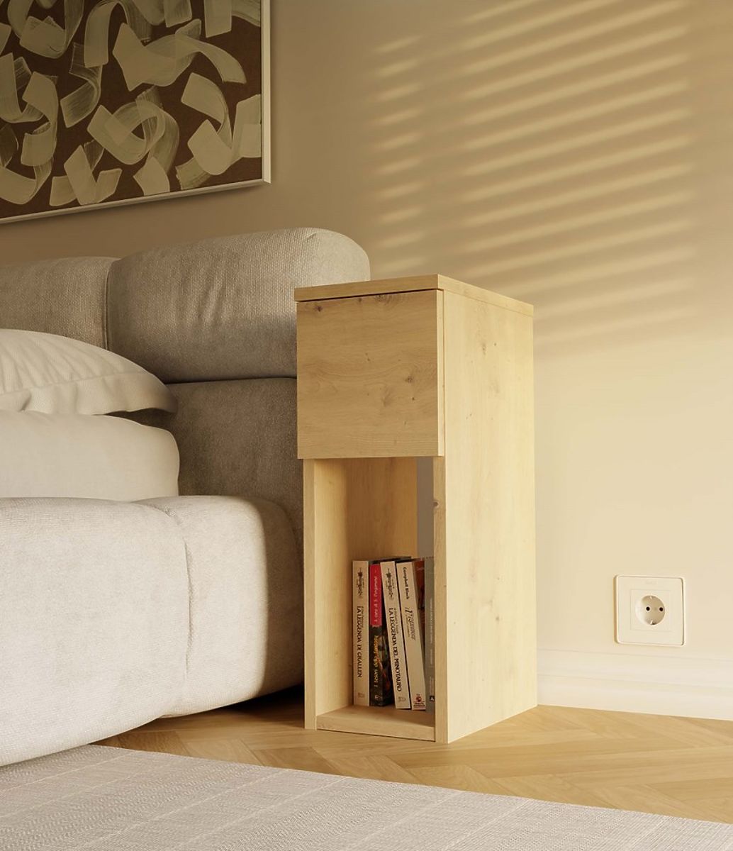 Il comodino GALAX 20 1S è un complemento pratico ed estetico per ogni camera da letto. Dotato di uno scaffale aperto e un cassetto, è perfetto per riporre un libro, telefono, caricabatterie o altri oggetti che vuoi avere sempre a portata di mano.