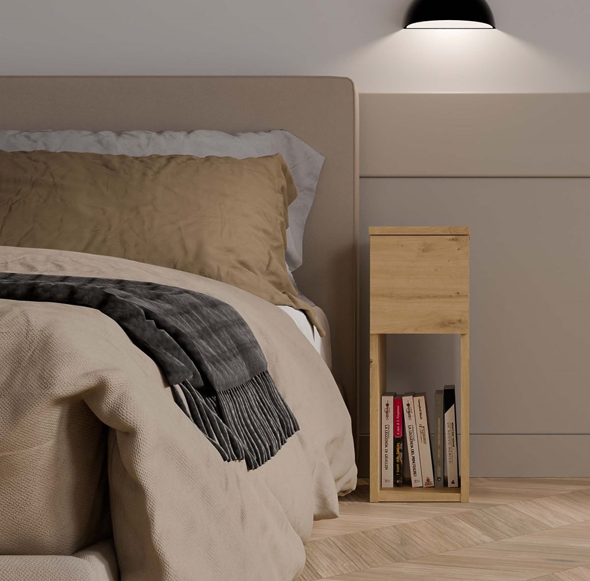 Il piano del comodino è il luogo ideale per una lampada da notte, una sveglia o accessori decorativi. Il colore classico del mobile dona freschezza e leggerezza all'interno, adattandosi sia ad arredi moderni che tradizionali.