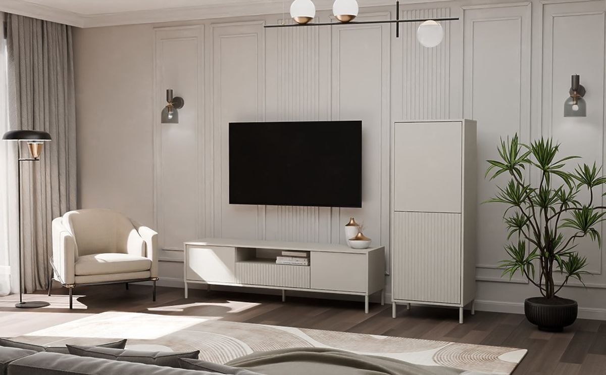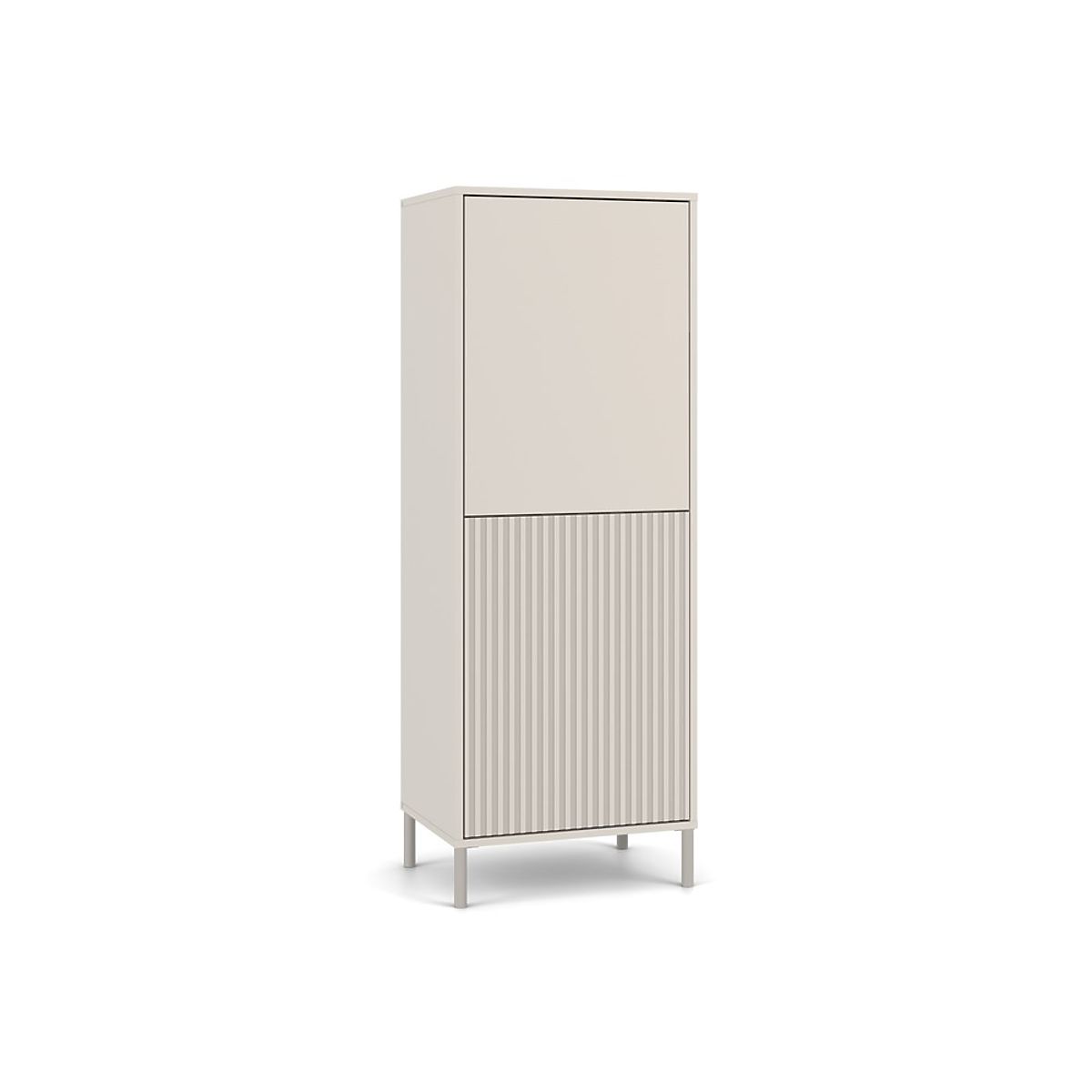 ELEGANZA E PRATICITÀ IN UNOLa vetrina KAMARO 2DK SLIM/LISCIO CASHMERE è una combinazione di estetica e funzionalità, perfetta per il soggiorno, la camera degli ospiti, la camera da letto o lo studio. La combinazione di ante con pannello frontale liscio e ante con pannello frontale rigato che ricorda le lamelle conferisce carattere, e il sistema TIP-ON permette un utilizzo comodo senza maniglie. Il mobile offre ampio spazio di archiviazione ed è un elemento stiloso in un interno moderno.