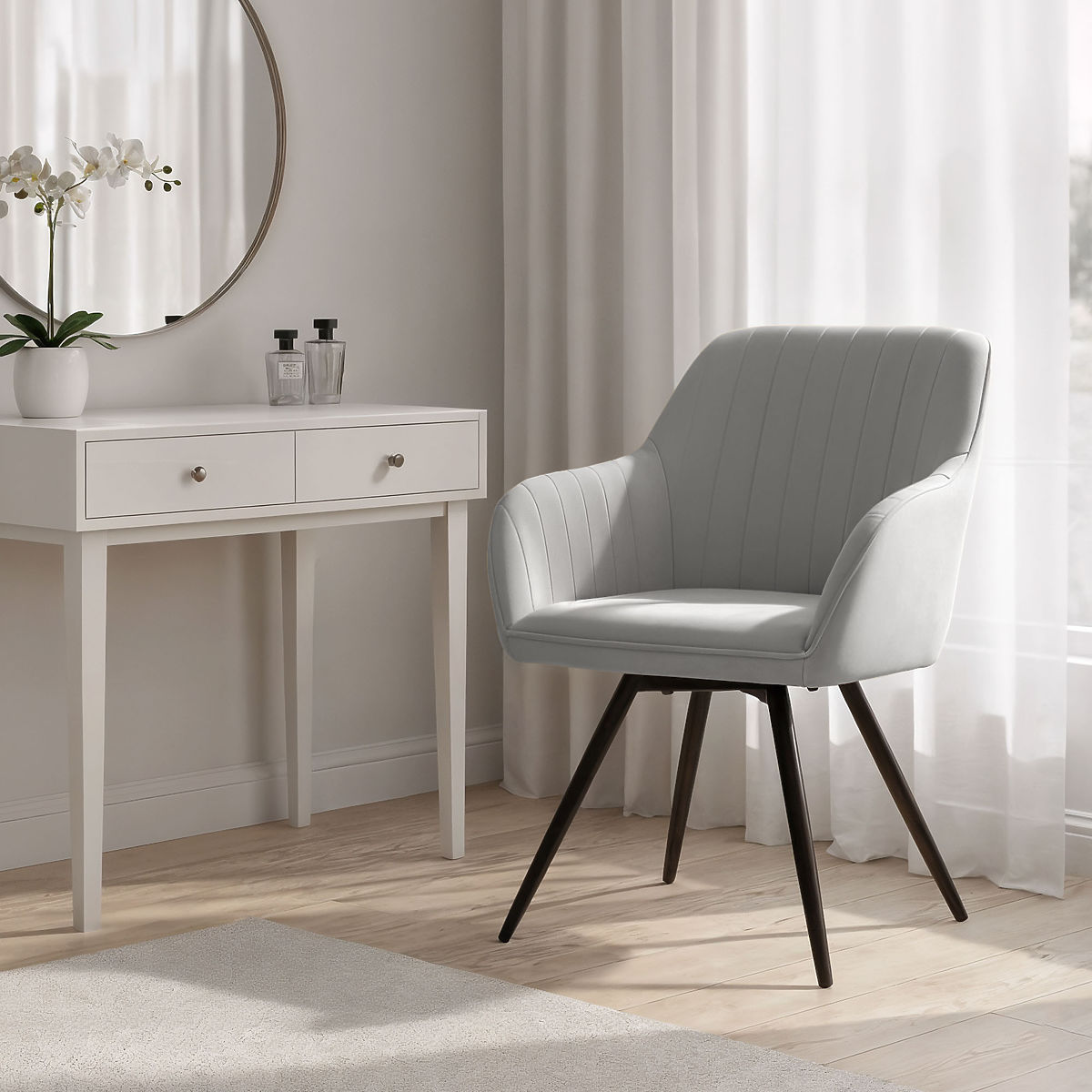Sedia girevole in velluto grigio con gambe nere e cuciture verticali. .. altro