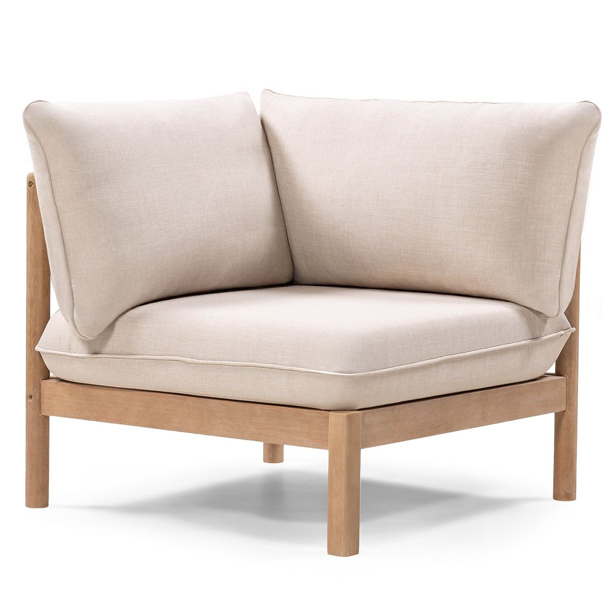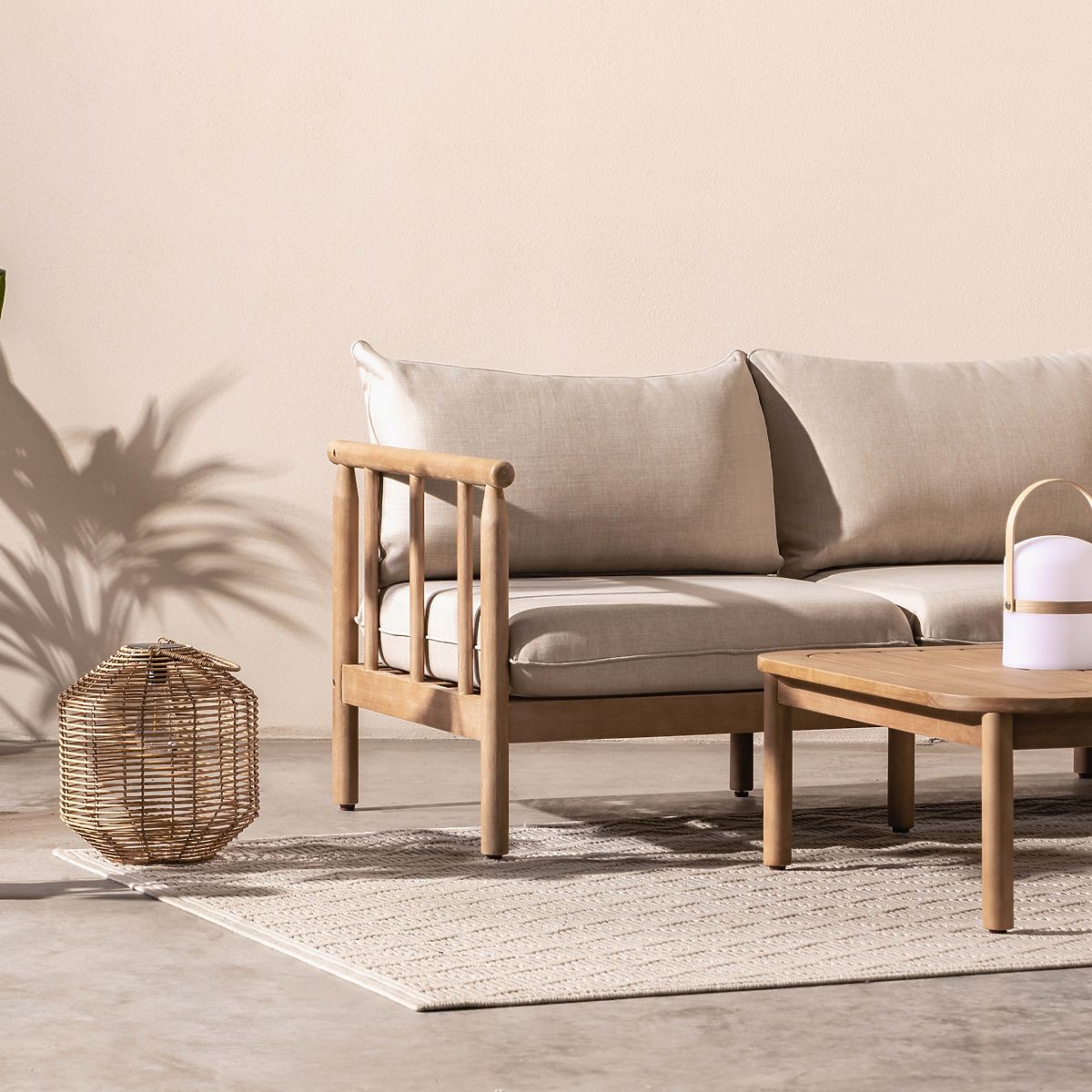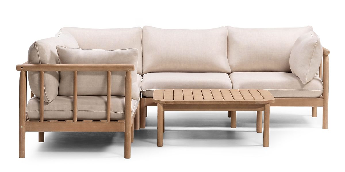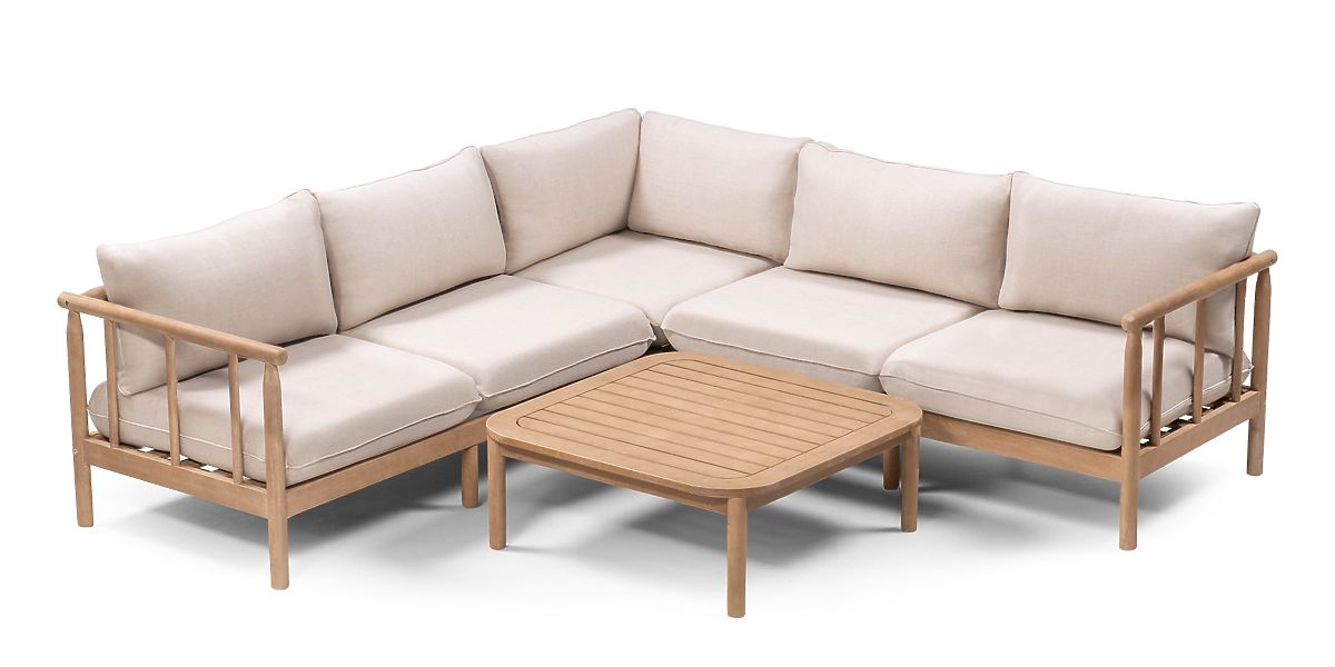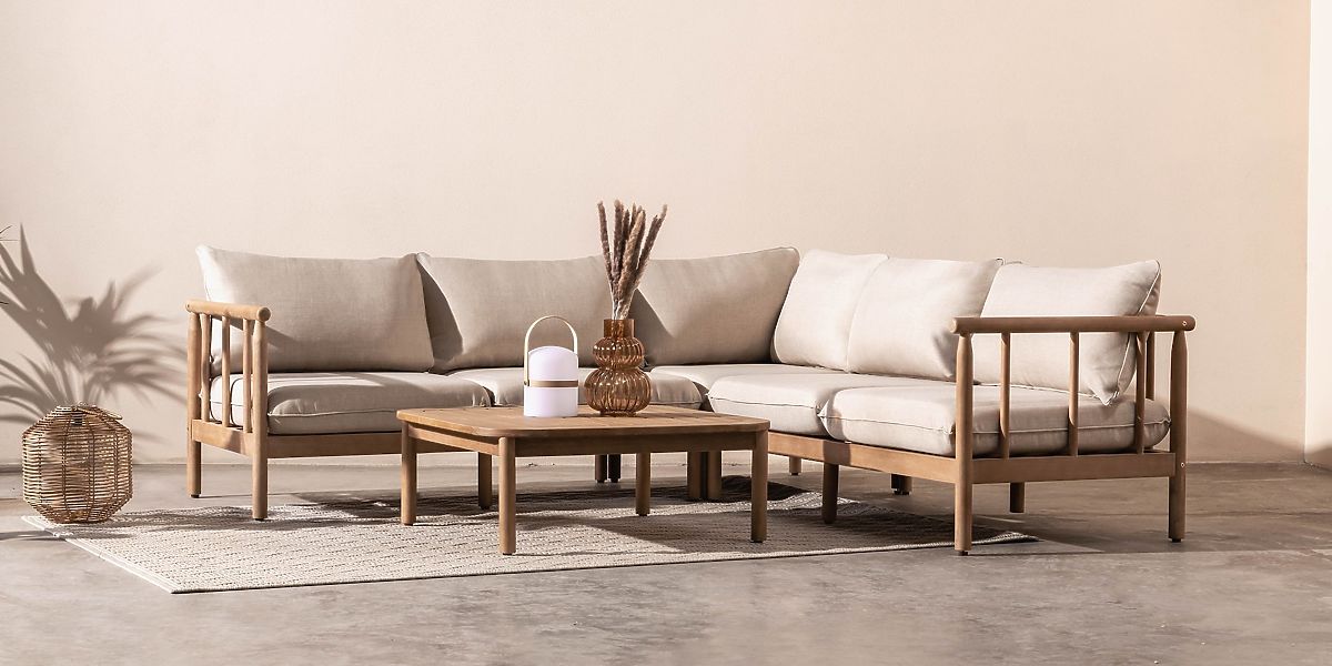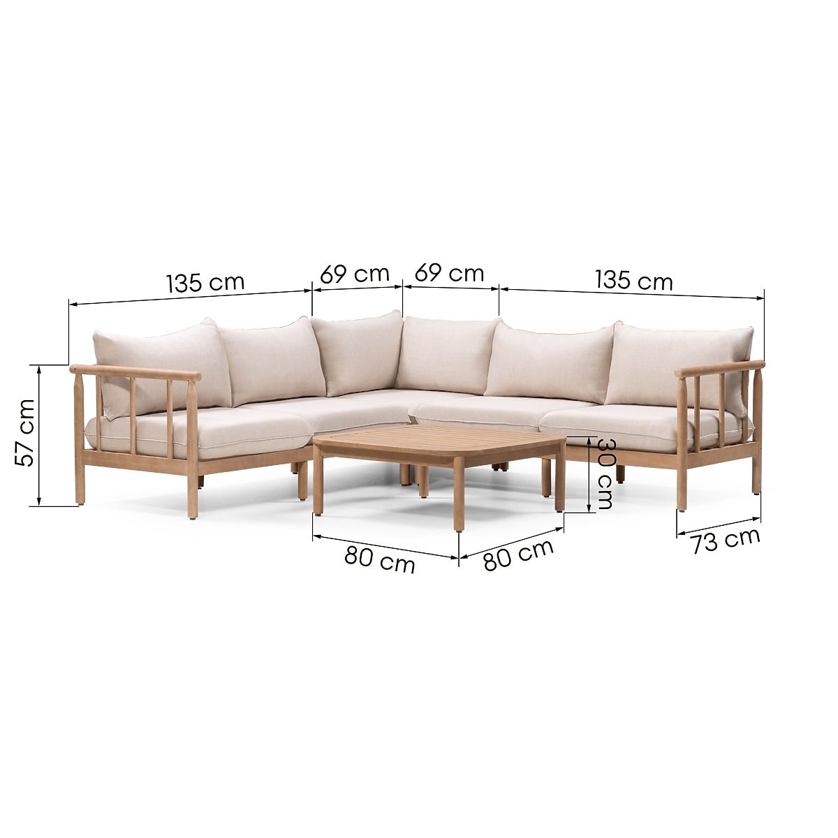 Divano angolare da giardino con tavolino Mortlake, legno di eucalipto FSC, finitura teak, beige chia