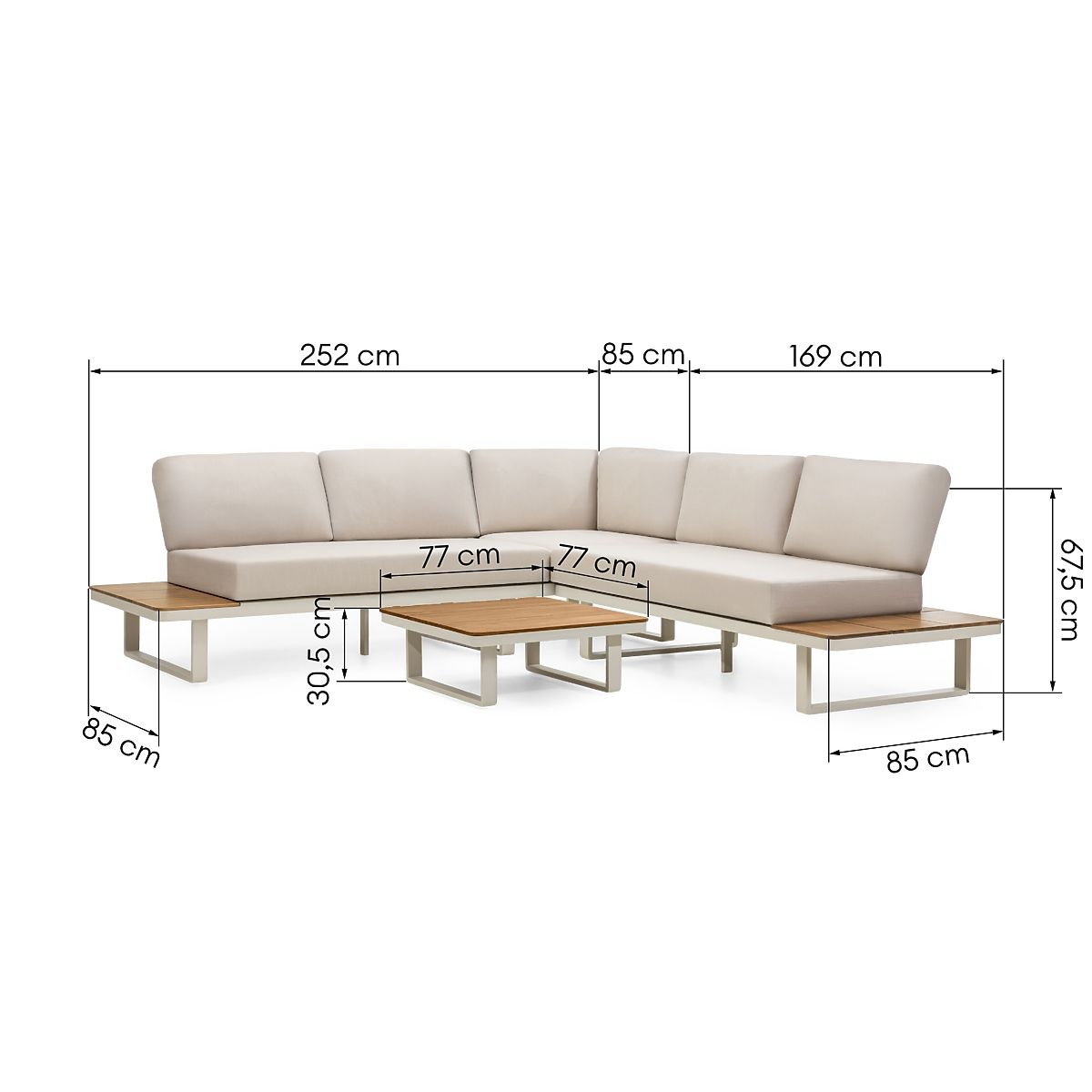 Crea un angolo relax unico con il divano angolare da giardino Porticato, che unisce eleganza e robustezza. Realizzato in alluminio resistente alla corrosione e legno di acacia durevole, Porticato ti affascinerà con la sua resistenza e bellezza per molte stagioni. Il pratico tavolino e le mensole alle estremità del divano angolare offrono ulteriore spazio per tutto il necessario per i momenti di relax in giardino. I cuscini confortevoli garantiscono il massimo comfort e le loro fodere con cerniera, realizzate in tessuto di poliestere idrofobo, limitano efficacemente l'assorbimento dei liquidi, offrendo così protezione dall'umidità e dallo sporco. Tuttavia, per prolungarne la durata, è consigliabile conservarli in un luogo coperto durante la pioggia.