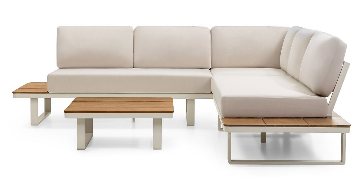 Divano angolare da giardino con tavolino Porticato, legno di acacia FSC, effetto teak, beige chiaro