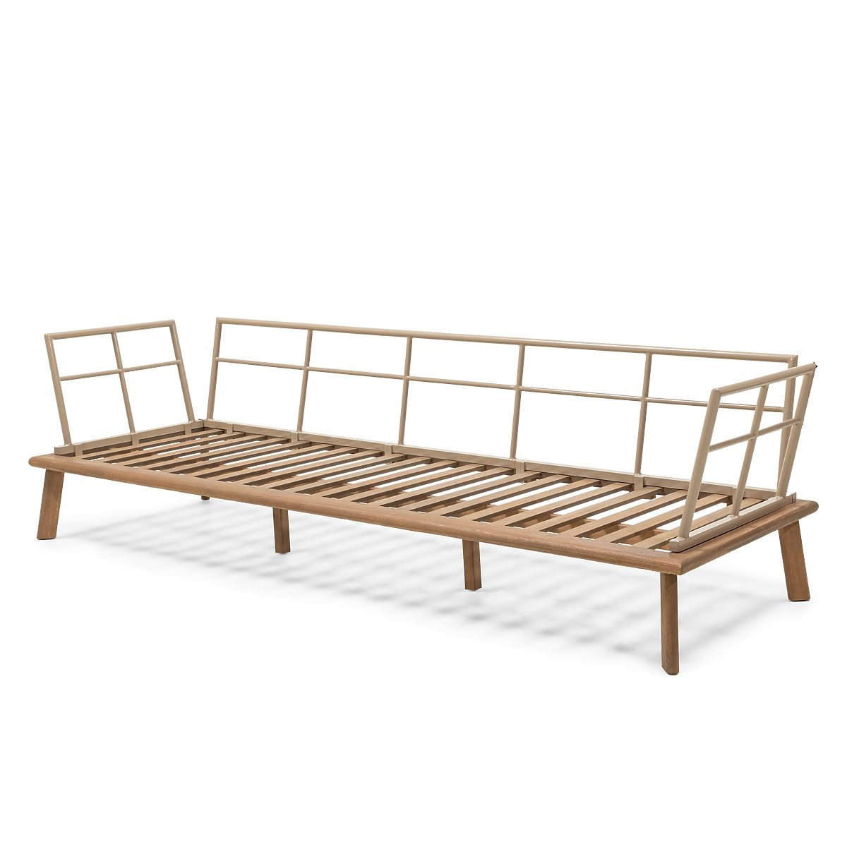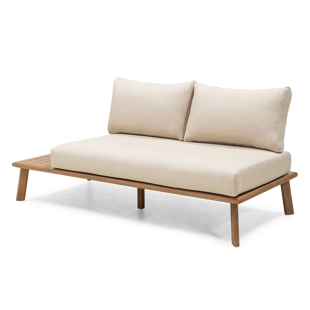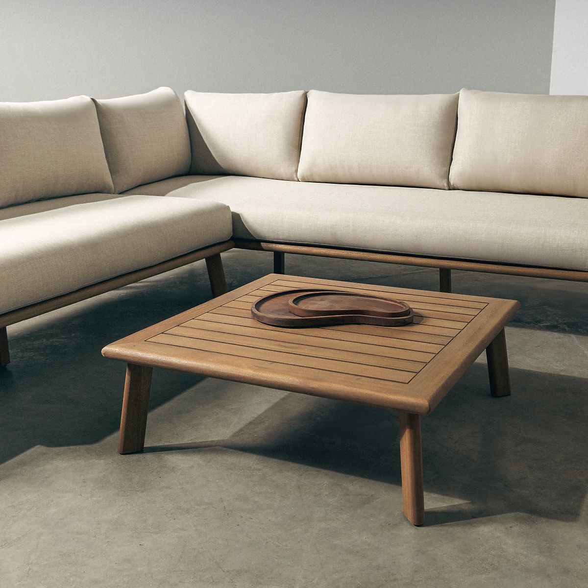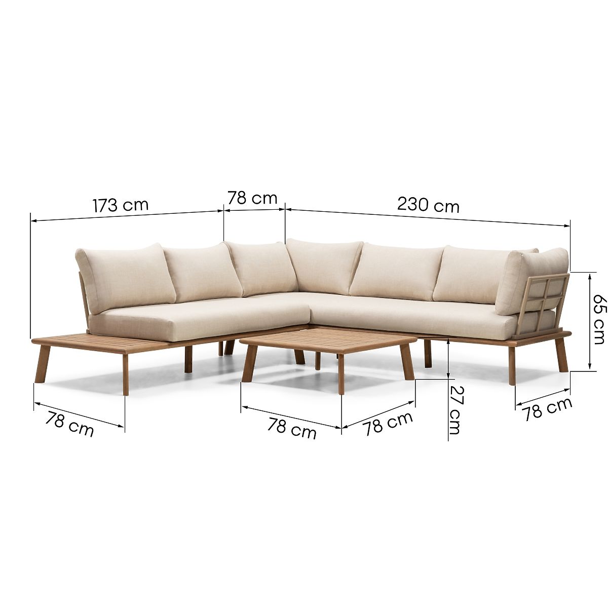 Divano angolare da giardino in legno di eucalipto con tavolino e cuscini beige. .. altro