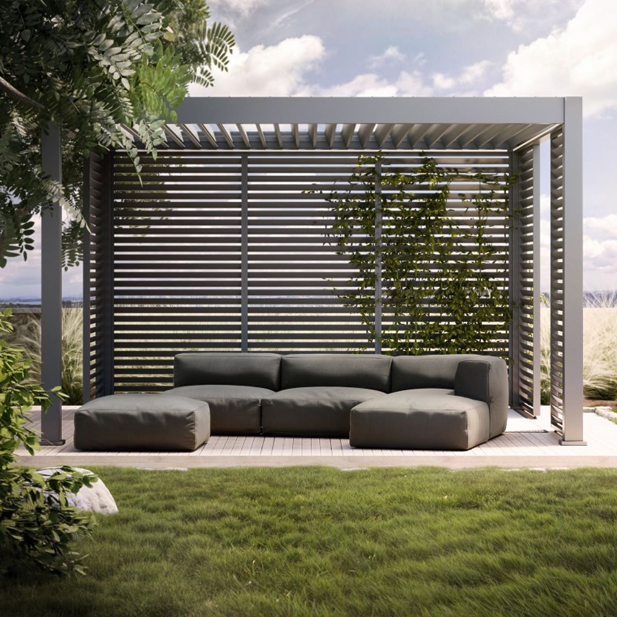 Divano angolare modulare da giardino in tessuto grigio impermeabile. .. altro