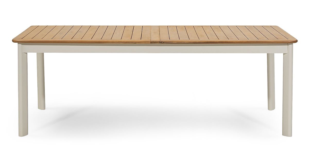 Sia il tavolo che le sedie Porticato hanno una struttura leggera ma robusta in alluminio verniciato a polvere di colore beige chiaro. Questa soluzione garantisce resistenza alla corrosione e ai danni meccanici. Il piano del tavolo allungabile, realizzato in resistente legno di acacia con finitura teak, consente di adattare facilmente la sua lunghezza al numero di ospiti e all'occasione. Un ulteriore vantaggio è il certificato FSC®, che conferma l'origine del legno da fonti gestite in modo responsabile.