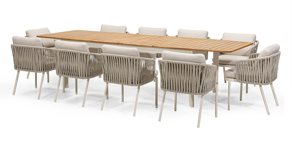 Dodici comode poltrone con intreccio in corda e morbidi cuscini offrono un elevato comfort anche durante lunghe sedute. I rivestimenti idrorepellenti sono rimovibili e facili da mantenere. Grazie all'uso di materiali di qualità, il set è resistente agli agenti atmosferici e adatto per un uso esterno prolungato.