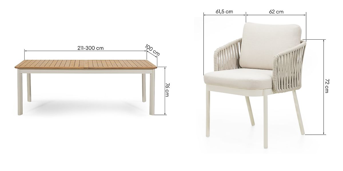 Il set di mobili da giardino Porticato del marchio Hector rappresenta una soluzione di lusso per grandi terrazze e giardini. Combina legno massiccio di acacia con una struttura in alluminio leggera ma robusta in una elegante tonalità beige. Il pezzo forte del set è il tavolo allungabile, facilmente adattabile al numero di ospiti.