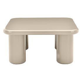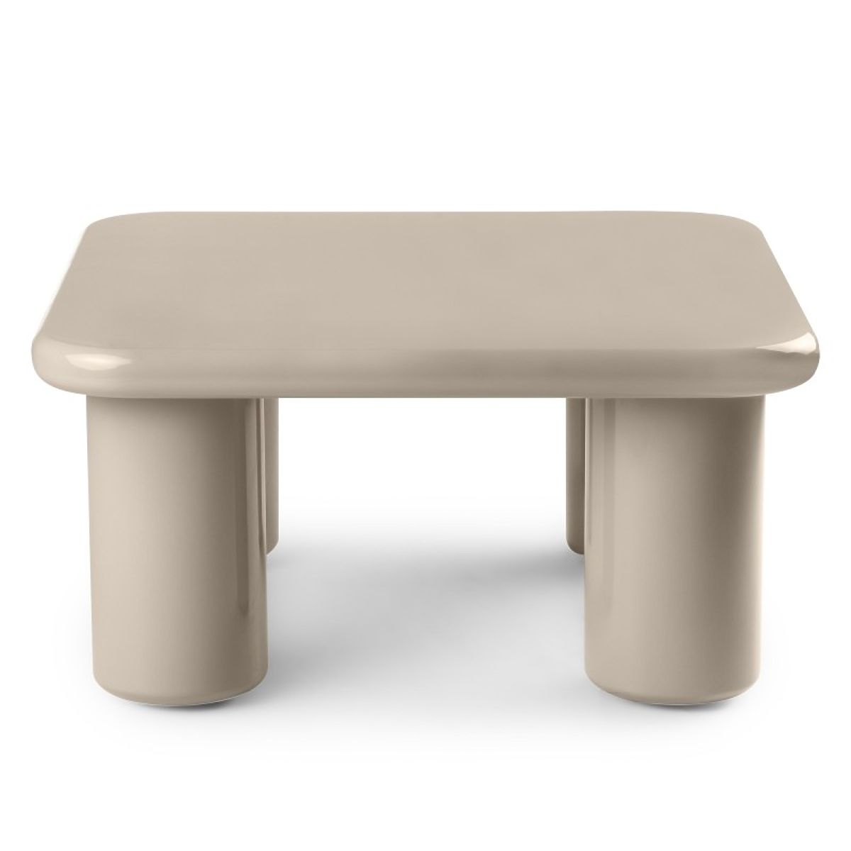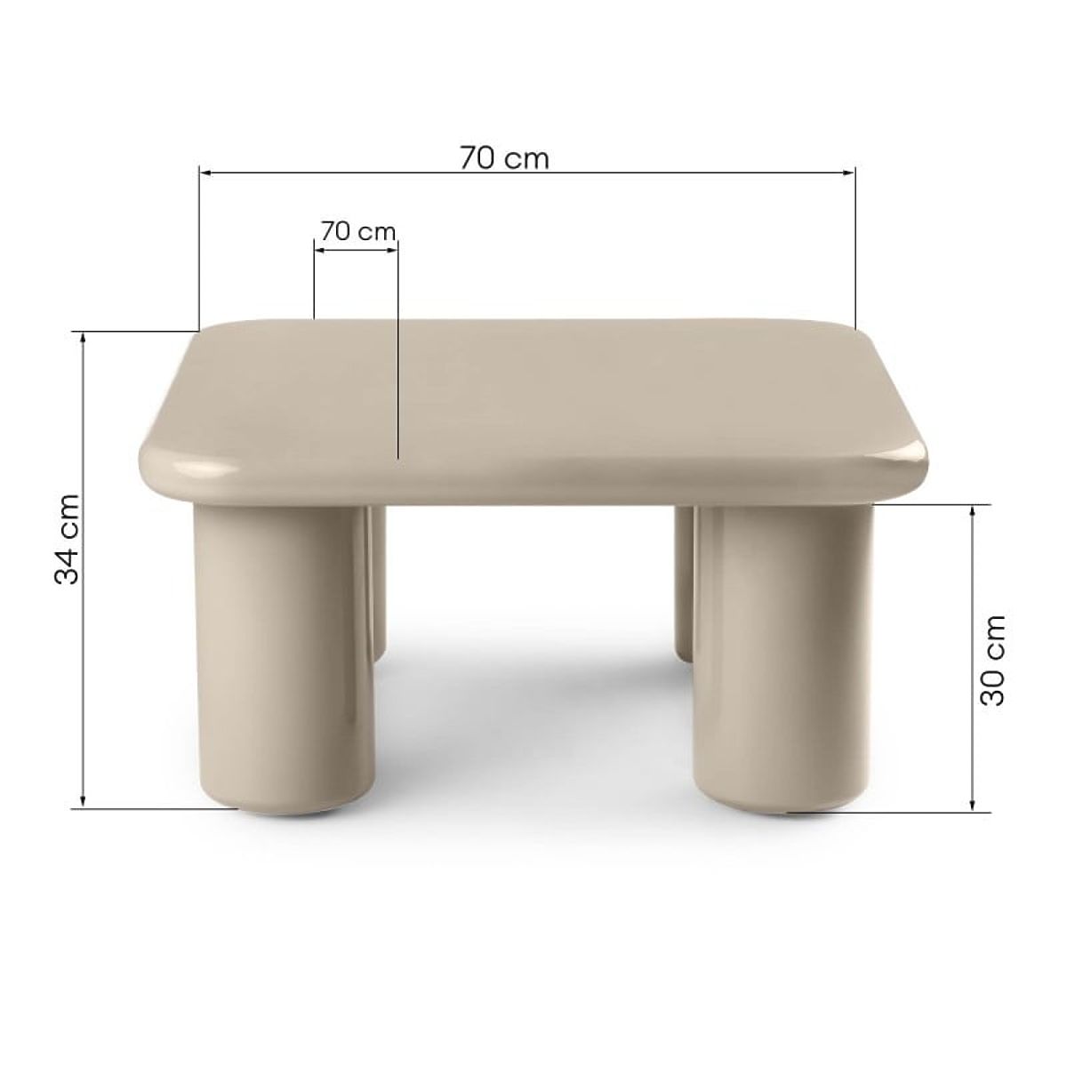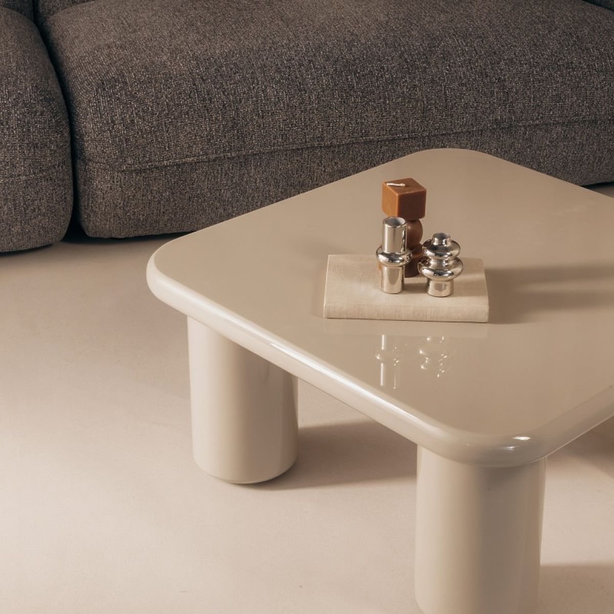 Tavolino beige scuro con superficie lucida e bordi arrotondati. .. altro