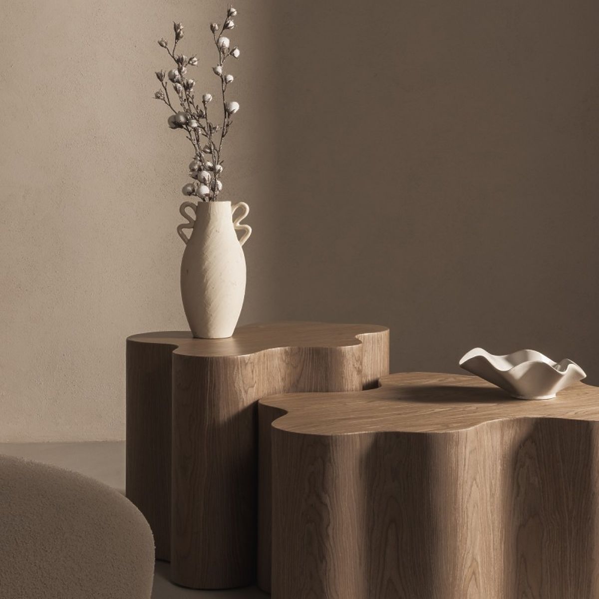 Tavolino laterale in MDF con impiallacciatura noce e forme arrotondate. .. altro