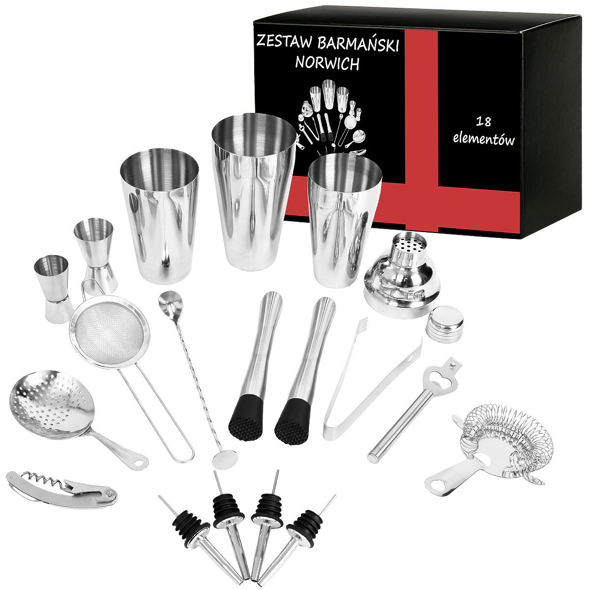 Set da barman di alta qualità in acciaio inossidabile. Contiene tutto il necessario - boston shaker, cobbler, misurini, versatori e altro ancora. Elenco dettagliato sotto. L'intero set è realizzato in acciaio pregiato, grazie al quale le bevande mantengono il loro sapore unico. Il set può essere comodamente lavato in lavastoviglie. Consigliato come regalo.