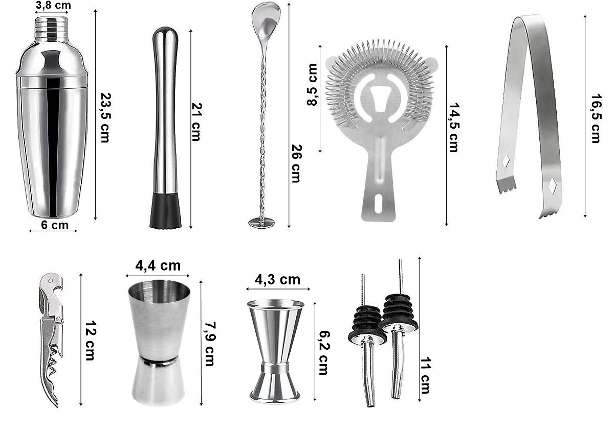 Organizzi una festa e vuoi sorprendere i tuoi ospiti? Il set da barman ti aiuterà a ravvivare l'atmosfera e a preparare drink originali e interessanti. Ogni elemento del set è realizzato in acciaio inossidabile di altissima qualità, il che non altera il gusto delle bevande. Il set contiene fino a 11 pezzi: 10 accessori in acciaio inossidabile e un supporto in legno di pino sottoposto a carbonizzazione.