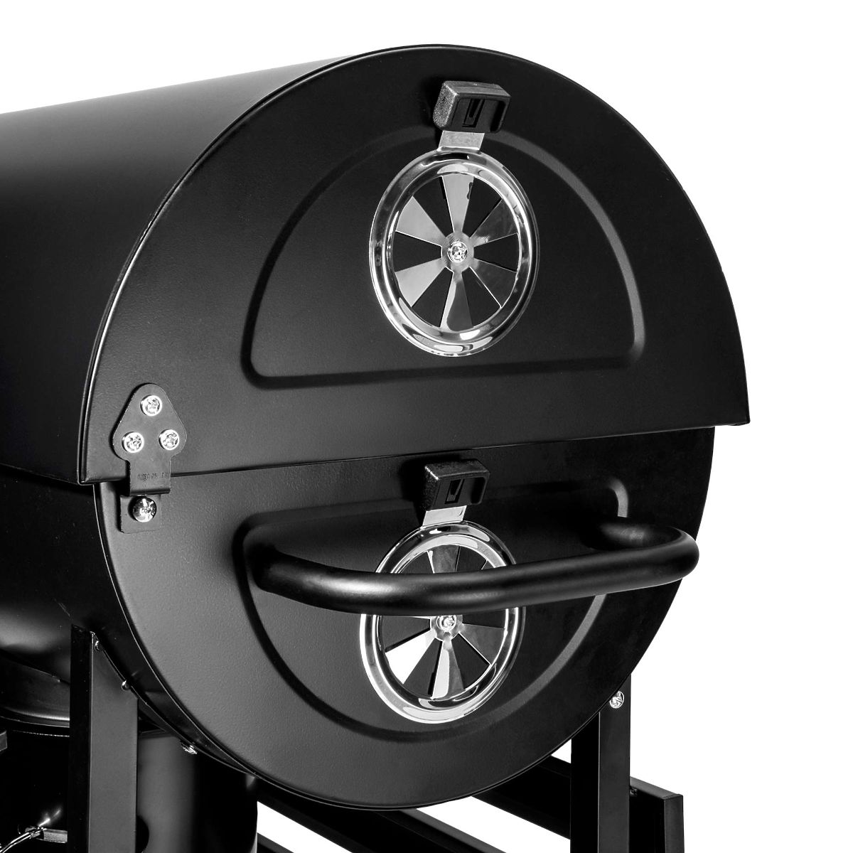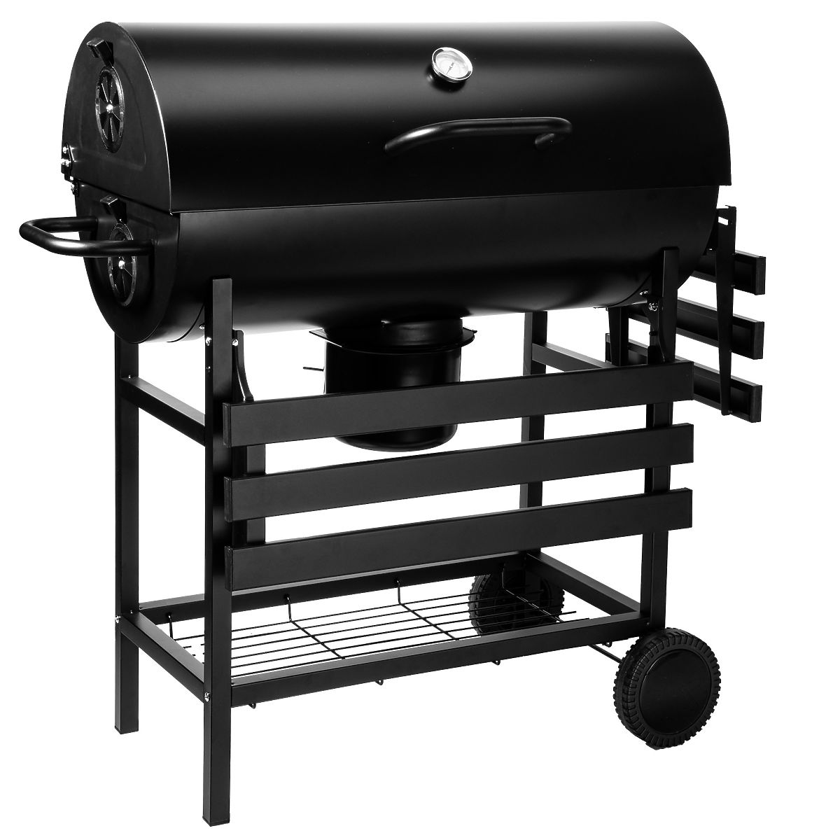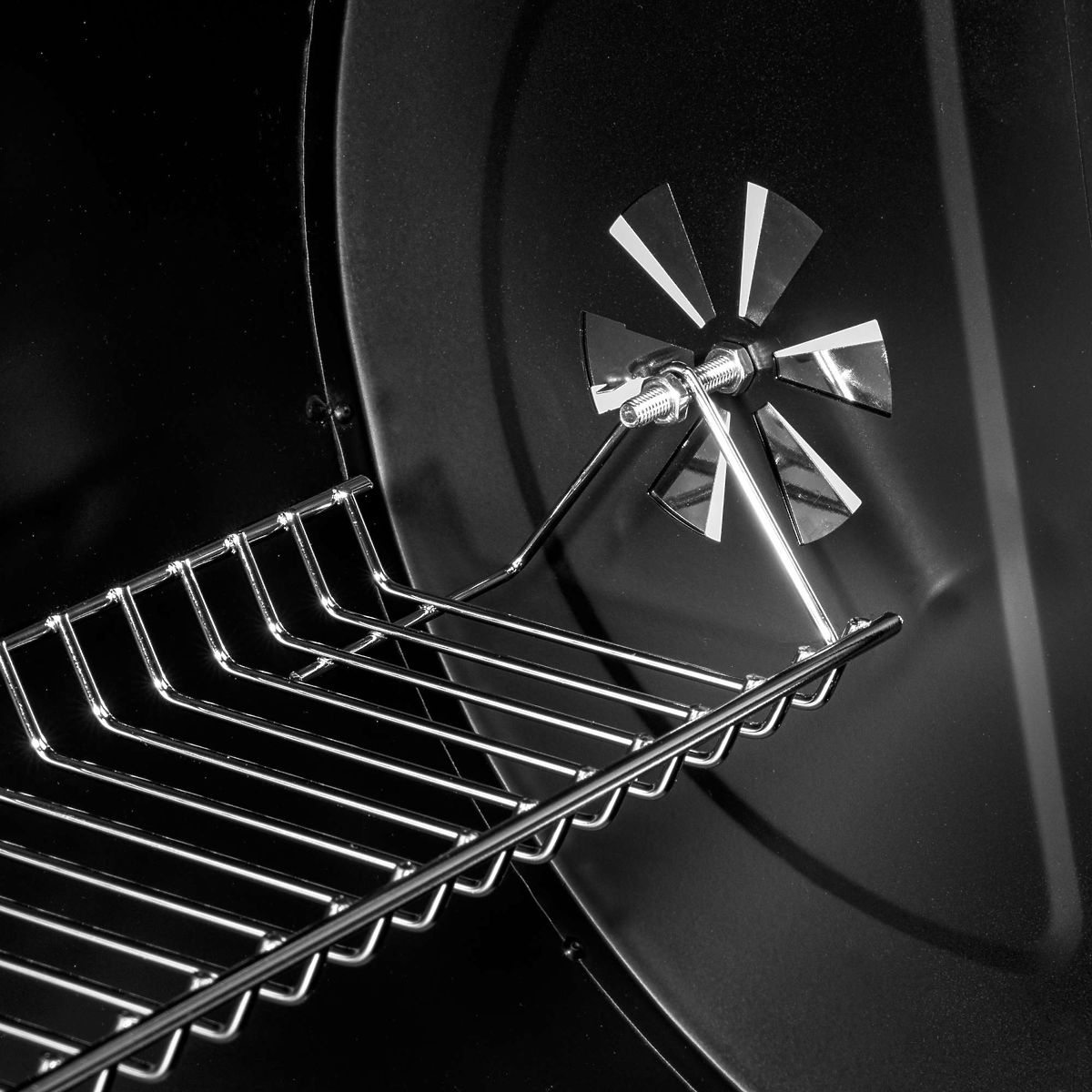 Barel offre non solo un ampio spazio per grigliare, ma anche soluzioni pratiche che facilitano il barbecue. Due mensole metalliche pieghevoli ai lati sono il luogo ideale per spezie, utensili o altri accessori necessari. Grazie a due aperture di ventilazione, posizionate sul lato sinistro e sul coperchio, hai il pieno controllo del flusso d'aria, permettendo una regolazione precisa della temperatura all'interno della griglia.