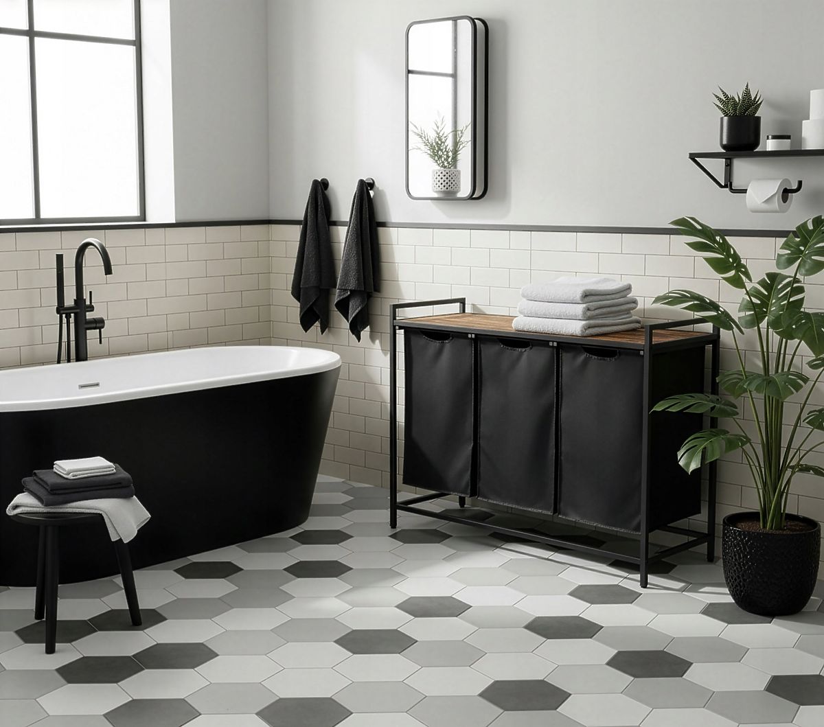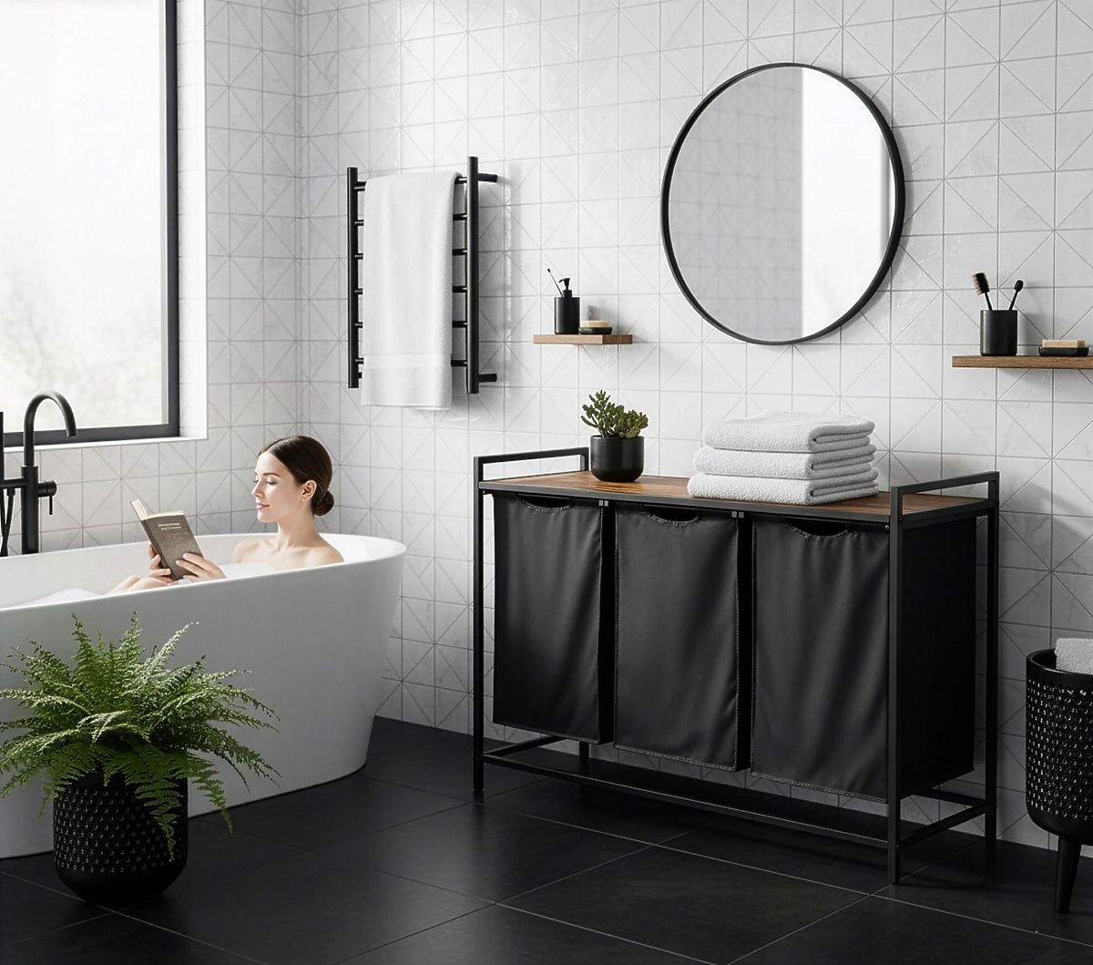 Il cesto per biancheria a tre scomparti Artus è una soluzione eccellente per chi apprezza ordine e funzionalità nello spazio del bagno. Il suo design loft, industriale, si adatta perfettamente agli interni moderni, offrendo il massimo comfort e risparmio di spazio. I tre scomparti separati permettono una precisa segregazione della biancheria, facilitando l'organizzazione delle attività quotidiane. Inoltre, il pratico scaffale sopra i cesti è il luogo ideale per asciugamani e accessori da bagno. Con il cesto Artus non solo arricchisci l'estetica del tuo bagno, ma ne aumenti anche la funzionalità.