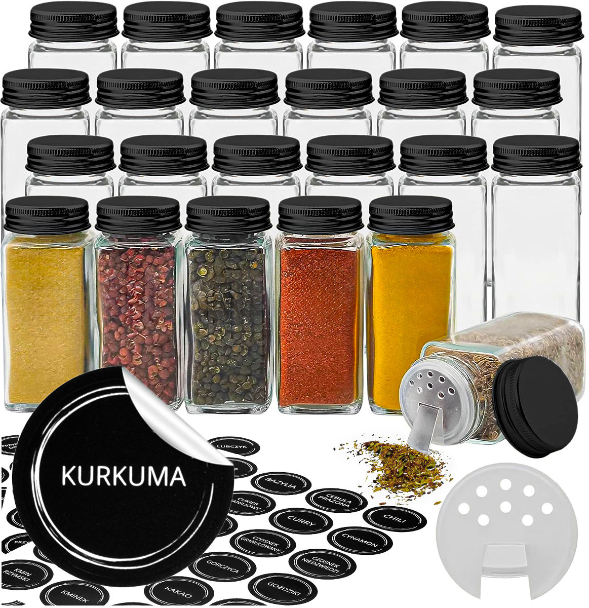 Un elegante set di barattoli per spezie in vetro trasparente con coperchi metallici neri facilita l'organizzazione e aggiunge eleganza alla cucina. Contiene 24 barattoli con una capacità di 120 ml ciascuno, dotati di pratiche etichette con i nomi delle spezie. Grazie alla possibilità di disposizione in piano o verticale, il set è estremamente funzionale e si adatta alle esigenze individuali dell'utente.