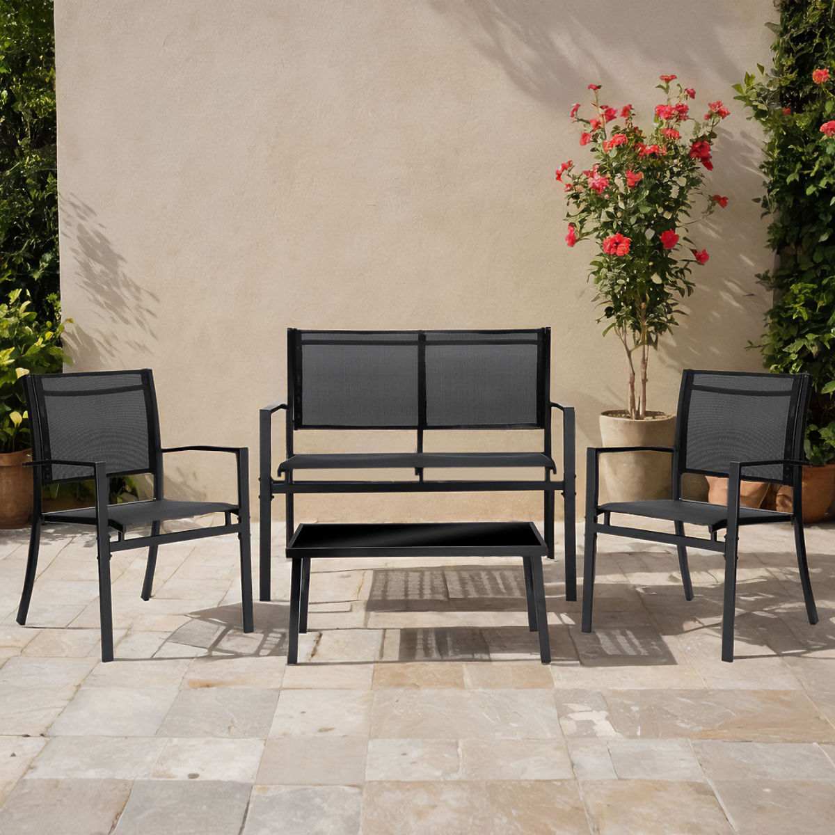 Il set comprende: un divano a due posti, due poltrone e un tavolino con piano in vetro temperato, creando un insieme ideale per il relax all'aperto.