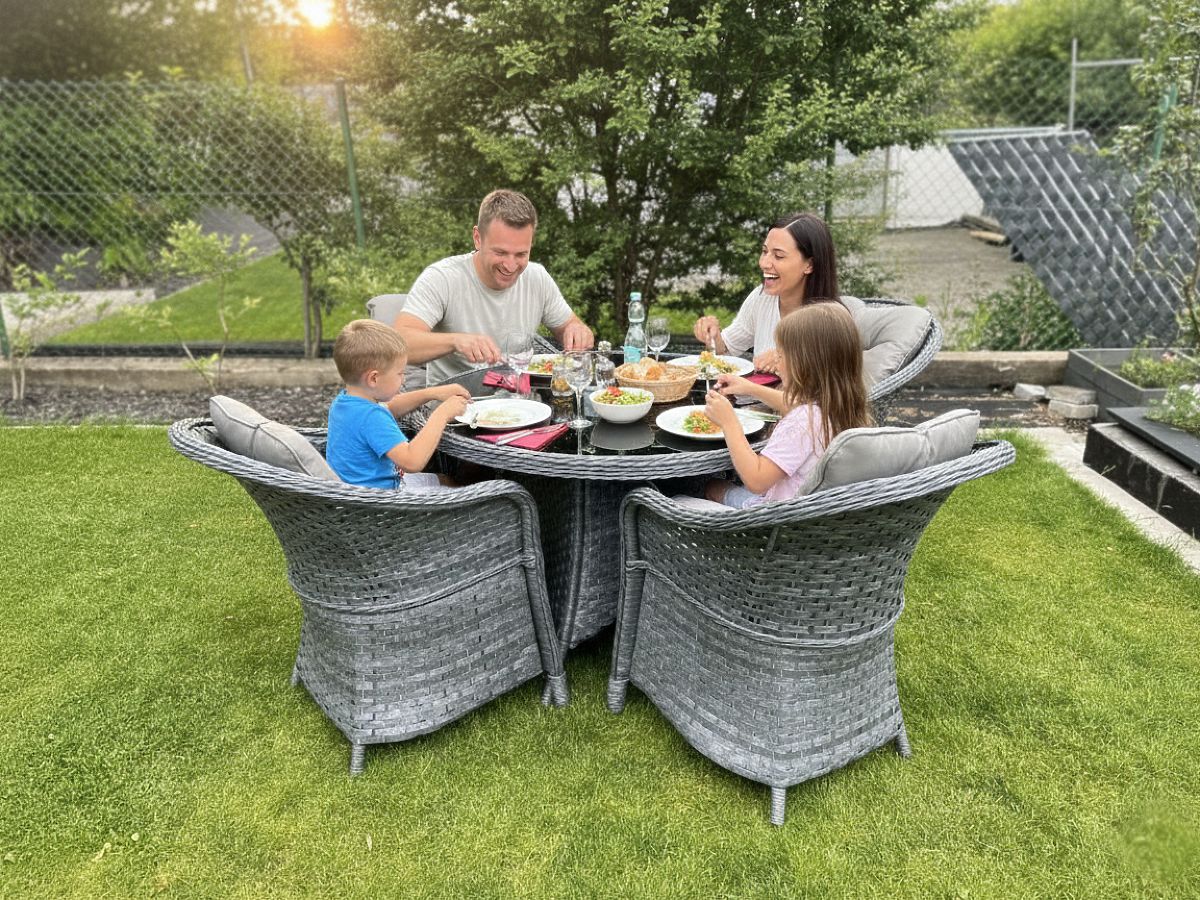 Il set da pranzo MODERNO è la quintessenza del design moderno e dell'approccio innovativo all'arredamento degli interni. Presenta un design originale che si distingue dalle soluzioni standard e offre non solo estetica, ma anche una durata ineguagliabile grazie all'uso di rattan sintetico di alta qualità. L'assoluta resistenza agli agenti atmosferici rende questo set una scelta ideale sia per interni che per spazi esterni. Scegliendo il set MODERNO, investi in mobili che non solo appaiono belli, ma sono anche progettati per un uso duraturo, soddisfacendo le aspettative dei clienti più esigenti alla ricerca di una combinazione unica di funzionalità, durata e stile contemporaneo. Colore del set: grigio melange, non uniforme Colore dei cuscini: grigio scuro Intreccio: tecnorattan piatto 17 mm x 1,2 mm e tecnorattan rotondo, struttura liscia Struttura: acciaio Set composto da 5 elementi: 4 x poltrona: larghezza: 56 cm profondità: 70 cm altezza: 81 cm 1 x tavolo (con piano in vetro nero di sicurezza da 5 mm): diametro: 120 cm altezza: 74 cm Altre dimensioni: Altezza della seduta della poltrona: 38 cm + 5 cm cuscino Altezza dello schienale dalla seduta: 50 cm Larghezza dei braccioli e dello schienale: 5 cm Larghezza e profondità della seduta: 52 x 52 cm Il set viene spedito su 1 pallet di dimensioni 120x100x210 cm, peso 70 kg Cuscini in colore grigio scuro per le sedute inclusi nel prezzo del set (4 pezzi) Tutti hanno fodere rimovibili con cerniera, realizzate in materiale per esterni (100% poliestere), lavabili a basse temperature. Le fodere dei cuscini sono cucite in tessuto di alta qualità rivestito in teflon, che le protegge dall'umidità. L'imbottitura dei cuscini è realizzata in schiuma di tappezzeria di alta qualità (media durezza - T25), che previene le deformazioni. Spessore dei cuscini: 5 cm. Possibilità di cucire cuscini su misura per questo set: https://www.bg-meble.pl/pl/p/Usluga-Krawiecka-Poduszki-Na-Zamowienie-/742 Possibilità di cucire fodere su misura per i cuscini di questo set: https://www.bg-meble.pl/pl/p/Usluga-Krawiecka-Poszewki-Na-Zamowienie/743 Per mantenere l'aspetto immutato dei mobili più a lungo, consigliamo di acquistare una copertura protettiva. La copertura in colore grigio scuro è monoblocco e ha un cordoncino regolabile sul fondo. Tutte le coperture sono realizzate su misura e il tempo di realizzazione è di circa 14 giorni lavorativi. Immagina mobili da giardino che superano le tue aspettative in ogni direzione – dalla resistenza al design. Questo è BELLO GIARDINO, dove ogni dettaglio ha importanza e il lusso incontra la funzionalità: Qualità senza tempo: Il nostro rattan sintetico garantisce che i mobili durino anni senza perdere bellezza o durata. Resistenza agli agenti atmosferici: I nostri mobili affrontano le condizioni atmosferiche più difficili, dal sole cocente agli inverni gelidi, rimanendo sempre belli. Comfort lussuoso: Cuscini spessi e morbidi invitano al relax, offrendo un comfort difficile da trovare altrove. Leggerezza e robustezza: La struttura in alluminio combina il meglio di entrambi i mondi – è leggera, ma straordinariamente stabile. Design che incanta: Ogni elemento dei nostri mobili è stato progettato con un occhio all'estetica e alla funzionalità, per adattarsi a qualsiasi ambiente. Che tu sia un amante del minimalismo o apprezzi arrangiamenti ricchi ed eleganti, i nostri mobili soddisferanno le tue aspettative, superando i confini della semplice funzionalità ed estetica. Garantiamo che anche i clienti più esigenti non potranno resistere al comfort e allo stile offerti da BELLO GIARDINO. Trasforma il tuo giardino, terrazza o balcone in un'oasi di relax ed eleganza che hai sempre desiderato. Non aspettare, scopri BELLO GIARDINO oggi stesso e trasforma i tuoi spazi esterni nei luoghi che hai sempre sognato. Foto dai nostri clienti