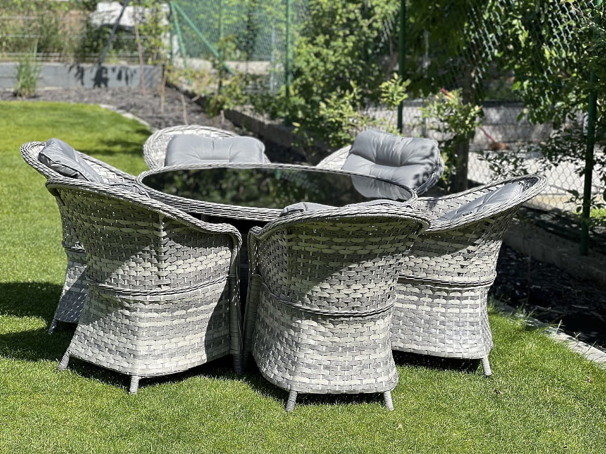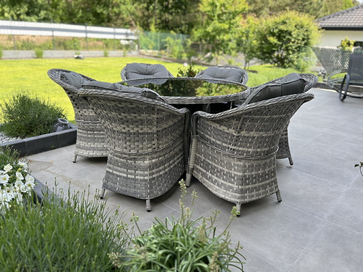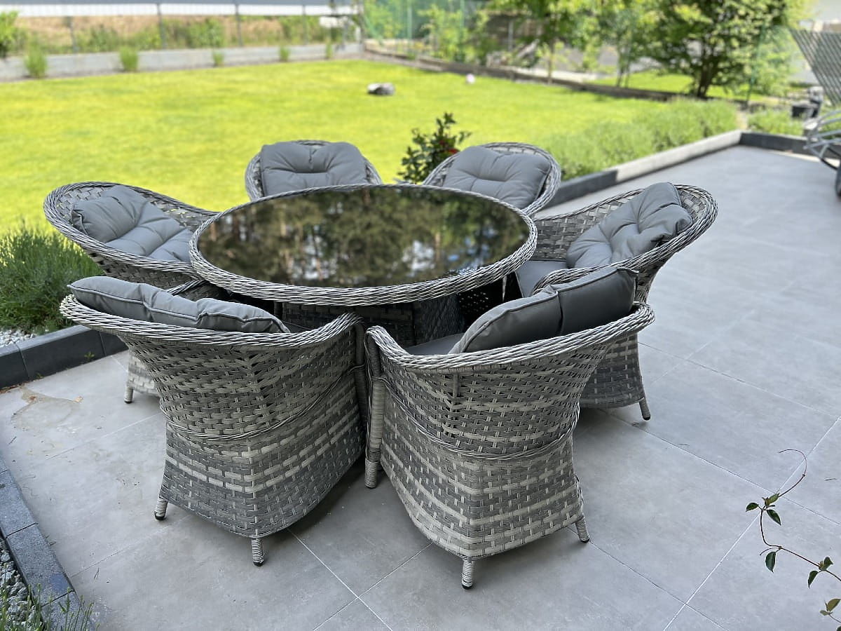 Il set di mobili da pranzo MODERNO è l'essenza del design moderno e dell'innovazione nel campo dei mobili per interni ed esterni. Offre una combinazione unica di design all'avanguardia e funzionalità, diventando il cuore di ogni spazio. Le poltrone e il tavolo di questa collezione sono realizzati in rattan sintetico di alta qualità, garantendo assoluta resistenza agli agenti atmosferici, assicurando longevità e durata. La scelta di materiali di altissima qualità rende MODERNO GRANDE ideale per i clienti più esigenti che cercano non solo bellezza, ma anche praticità e resistenza nei loro mobili da pranzo. Questo set è la soluzione ideale per chi desidera combinare eleganza e modernità nel proprio spazio abitativo. Colore del set: mélange grigio chiaro, non uniforme Colore dei cuscini: grigio scuro Intreccio: tecnorattan piatto 17mm x 1,2mm e tecnorattan rotondo, struttura liscia Struttura: acciaio Il set è composto da 7 elementi: 6 x poltrona: larghezza: 56 cm profondità: 70 cm altezza: 81 cm 1 x tavolo (con piano in vetro nero di sicurezza da 5mm): diametro: 120 cm altezza: 74 cm Altre dimensioni: Altezza seduta poltrona: 38 cm + 5 cm cuscino Altezza schienale dalla seduta: 50 cm Larghezza braccioli e schienale: 5 cm Larghezza e profondità seduta: 52 x 52 cm Il set viene spedito su 1 pallet di dimensioni 145x125x210 cm, peso 90 kg Cuscini in colore grigio scuro per le sedute inclusi nel prezzo del set (6 pezzi) Tutti hanno fodere rimovibili con cerniera, realizzate in materiale da esterno (100% poliestere), lavabili a basse temperature. Le fodere dei cuscini sono cucite in tessuto di alta qualità rivestito in teflon, che le protegge dall'umidità. L'imbottitura dei cuscini è realizzata in schiuma di tappezzeria di alta qualità (media durezza - T25), che previene deformazioni. Spessore dei cuscini: 5 cm. Possibilità di cucire cuscini su misura per questo set: https://www.bg-meble.pl/pl/p/Usluga-Krawiecka-Poduszki-Na-Zamowienie-/742 Possibilità di cucire fodere per cuscini su misura per questo set: https://www.bg-meble.pl/pl/p/Usluga-Krawiecka-Poszewki-Na-Zamowienie/743 Per preservare ancora più a lungo l'aspetto inalterato dei mobili, si consiglia di acquistare una copertura protettiva. La copertura in colore grigio scuro è monopezzo e ha un cordoncino regolabile in basso. Tutte le coperture sono cucite su ordinazione e il tempo di realizzazione è di circa 14 giorni lavorativi. Immaginate mobili da giardino che superano le vostre aspettative in ogni aspetto – dalla resistenza al design. Ecco BELLO GIARDINO, dove ogni dettaglio conta e il lusso incontra la funzionalità: Qualità inalterabile: Il nostro rattan sintetico garantisce che i mobili durino anni, senza perdere bellezza o durata. Resistenza agli agenti atmosferici: I nostri mobili affrontano le condizioni meteorologiche più difficili, dal sole cocente agli inverni gelidi, rimanendo sempre belli. Comfort lussuoso: Cuscini spessi e morbidi invitano al relax, offrendo un comfort difficile da trovare altrove. Leggerezza e resistenza: La struttura in alluminio combina il meglio di entrambi i mondi – è leggera, ma estremamente stabile. Design che incanta: Ogni elemento dei nostri mobili è stato progettato con attenzione all'estetica e alla funzionalità, per adattarsi a qualsiasi ambiente. Che siate amanti del minimalismo o apprezziate arrangiamenti ricchi ed eleganti, i nostri mobili soddisferanno le vostre aspettative, superando i confini della funzionalità e dell'estetica comuni. Garantiamo che anche i clienti più esigenti non resisteranno al comfort e allo stile offerti da BELLO GIARDINO. Trasformate il vostro giardino, terrazza o balcone in un'oasi di relax ed eleganza che avete sempre desiderato. Non aspettate, scoprite BELLO GIARDINO oggi stesso e trasformate i vostri spazi esterni nei luoghi che avete sempre sognato.