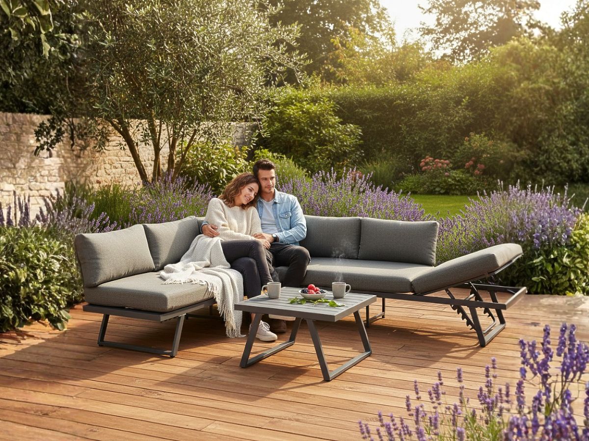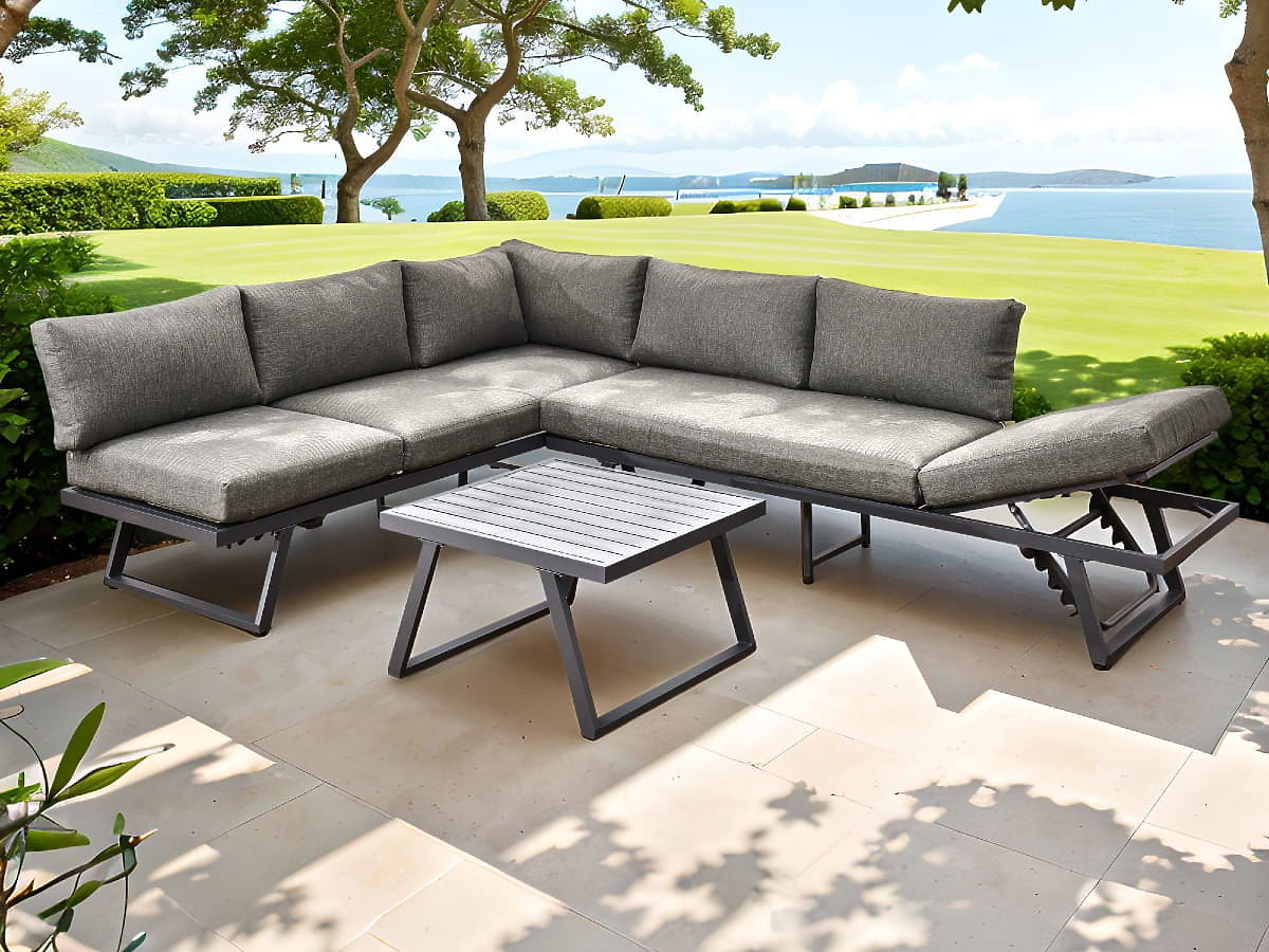 Divano angolare da giardino in alluminio con tavolino RADIOSO con schienale regolabile
