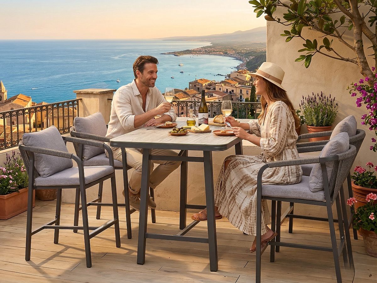 CONSEGNA PREVISTA ALL'INIZIO DI APRILE 2026 Il set di mobili BREZZA è un'offerta eccezionale per chi desidera portare un'atmosfera moderna e da club nel proprio giardino, terrazza o patio. Questo esclusivo set si distingue per la sua forma insolita per i mobili da giardino – è composto da un alto tavolo da bar e quattro comodi sgabelli da bar. È la soluzione ideale per celebrare le serate estive con drink, snack o conversazioni rilassate tra amici. Il sedile multistrato con schiuma a densità adeguata e lo schienale morbido assicurano che anche gli sgabelli alti diventino sinonimo di relax. Il grande piano del tavolo di 150 x 90 cm offre molto spazio per stoviglie e decorazioni, creando un punto centrale per ogni festa all'aperto. Specifiche tecniche: Nome del modello: BREZZA Tipo di set: Set da bar (tavolo alto + 4 sgabelli da bar) Dimensioni del tavolo: Lunghezza: 150 cm Larghezza: 90 cm Altezza: 101 cm Dimensioni dello sgabello da bar: Larghezza: 60 cm Profondità: 64 cm Altezza: 99 cm Cuscini: Sedile: Spessore 5 cm, struttura multistrato che garantisce durata e comfort (1 cm polipropilene 350 g + 3 cm schiuma/gomma 20D + 1 cm polipropilene 350 g). Schienale: Imbottitura in morbido cotone PP che si adatta perfettamente alla schiena. Scegliendo il set BREZZA, optate per uno stile insolito e funzionalità che trasformeranno il carattere del vostro spazio esterno. È un mobile che invita a trascorrere del tempo insieme all'aria aperta, unendo la libertà dell'atmosfera da bar con il comfort di casa. Create la vostra zona relax privata che incanterà gli ospiti e diventerà il luogo preferito per gli incontri estivi.