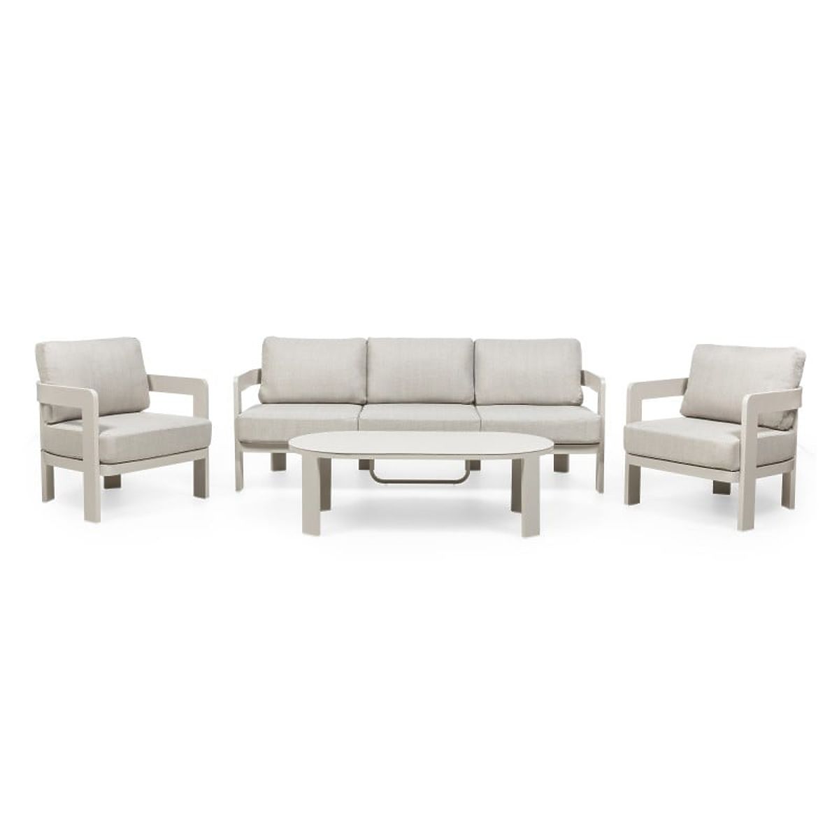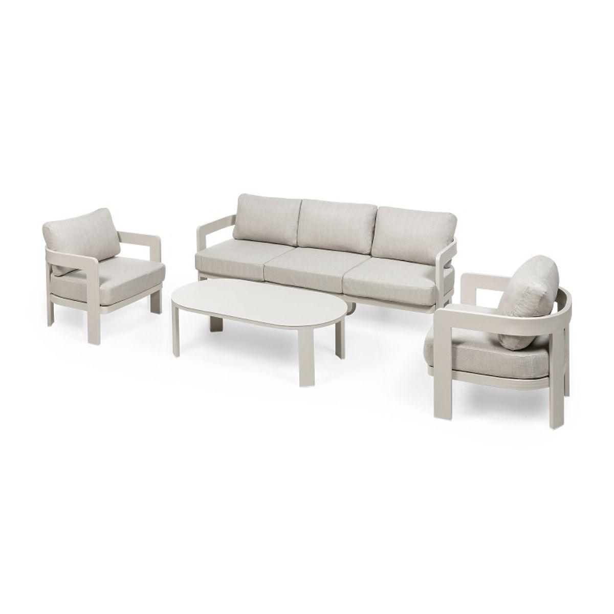 Japori unisce tranquillità ed eleganza in un unico set. La struttura leggera in beige chiaro e le forme arrotondate conferiscono allo spazio un carattere accogliente, mentre i morbidi cuscini e il tavolino da caffè ovale invitano a momenti di relax con stile.