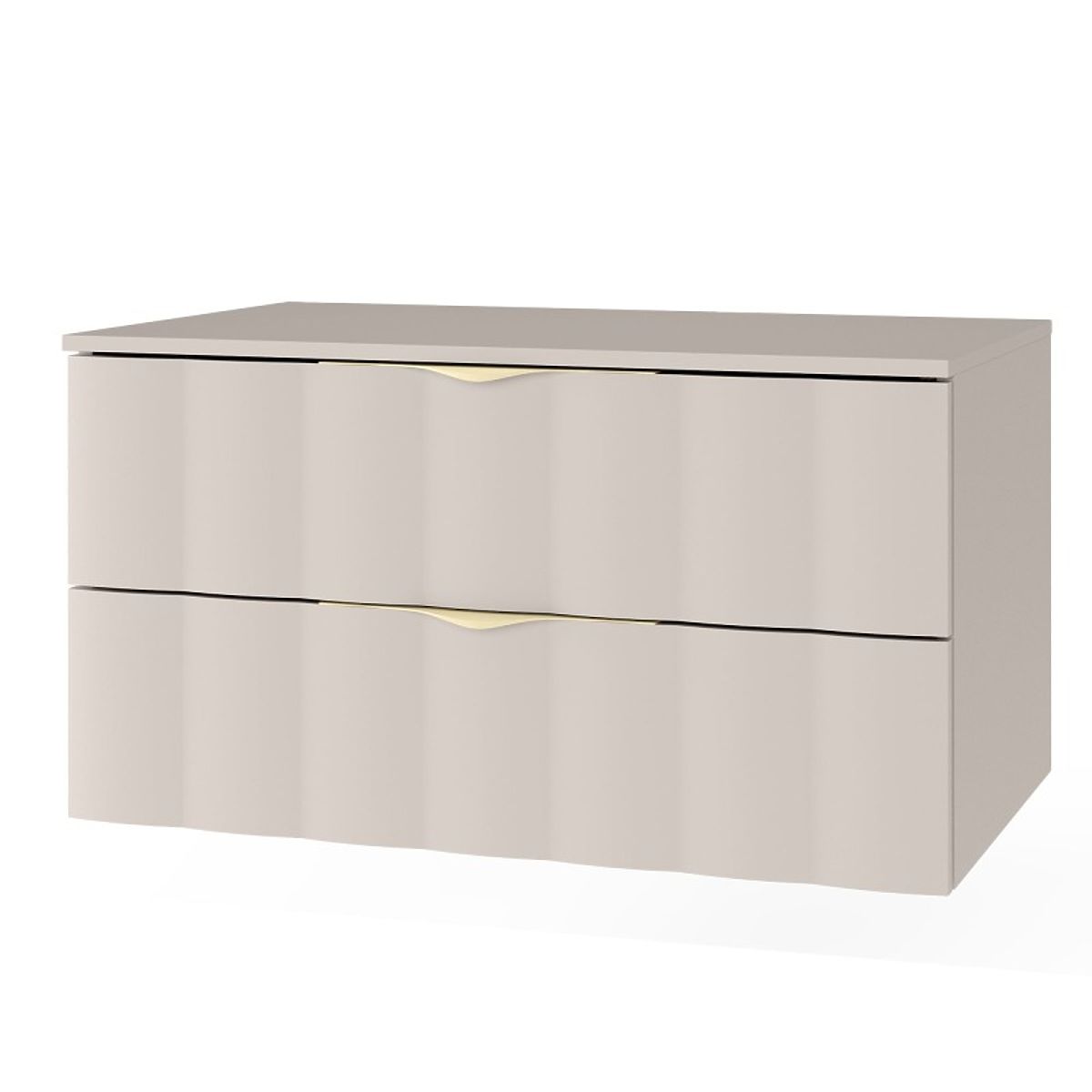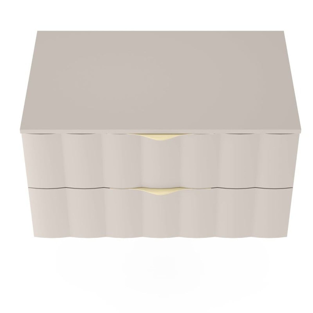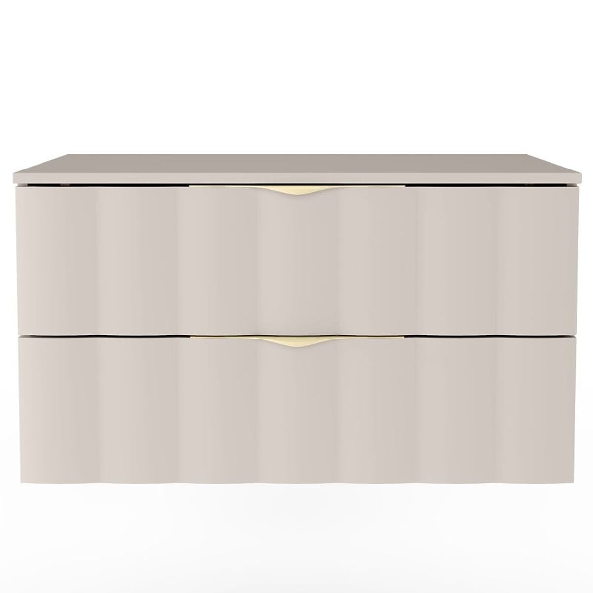 Elevate lo standard del vostro bagno con il mobiletto Omi in cashmere dal design elegante e pannello frontale ondulato. Due ampi cassetti con chiusura silenziosa e maniglie color oro spazzolato garantiscono un'organizzazione perfetta.